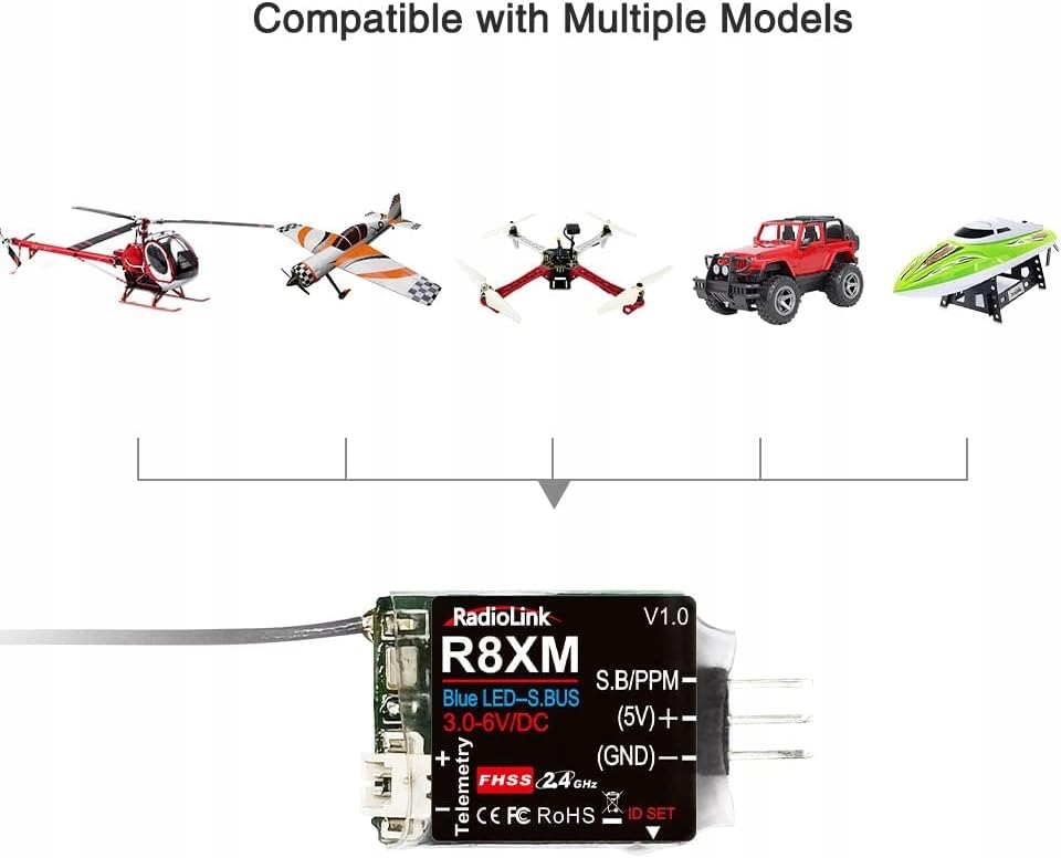 - Отличная защита от помех и большой диапазон управления: использование 67 каналов с разбросом частот FHSS обеспечивает сильную защиту от радиочастотных помех, что обеспечивает R8XM превосходную помехоустойчивость, высокую постоянная и стабильная передача сигнала.
