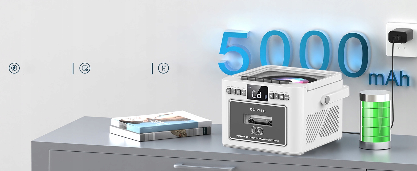 Кассетный проигрыватель компакт-дисков оснащен эффективной батареей емкостью 5000 мАч, заряжаемой с помощью кабеля Type-C 5 В/2 А. После 10 часов зарядки он может работать до 5 часов. Этот проигрыватель компакт-дисков подходит для использования как в помещении, так и на открытом воздухе. Попрощайтесь с надоедливой постоянной заменой аккумулятора и наслаждайтесь непрерывным воспроизведением музыки в любое время и в любом месте.