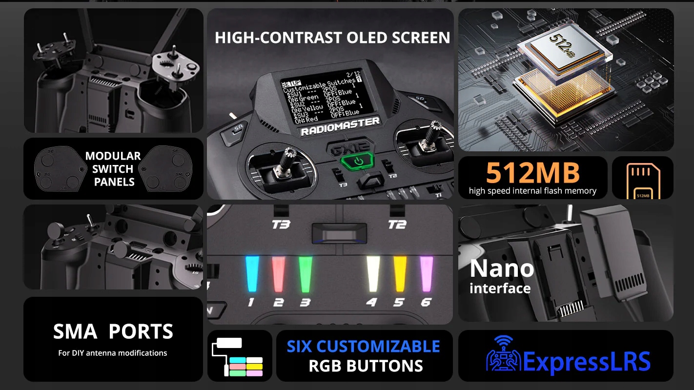 GX12 имеет ваш опыт RC, предлагая необычайную гибкость и современные функции. Заменяемые панели переключателей позволяют персонализировать благодаря прикрепленной модульной системе, а порты DIY SMA позволяют вам выбрать идеальные антенны для ваших нужд. Благодаря 512 МБ внутренней флэш-памяти, нет необходимости использовать карты TF, а один порт USB-C упрощает как зарядку, так и подключение к симулятору или передаче данных. GX12 также оснащен индивидуально программируемыми 6-позиционными кнопками и коммутаторами SA/SD, а также настраиваемыми индикаторами RGB, которые увеличивают функциональность и дают стиль.