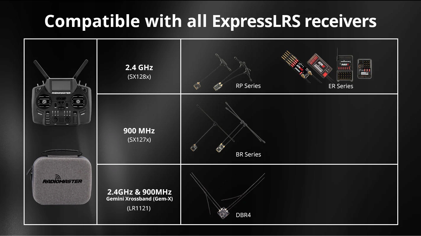 Мы представляем радиоконтроллер GX12 - прорывная комбинация новейшей технологии ExpressLRS и EdgetX. GX12 является первым контроллером, оснащенным ExpressLRS Gemini-xrossband (GEM-X), который обеспечивает одновременную передачу на частотах 2,4 ГГц и 915 МГц, что обеспечивает непревзойденную сопротивление помехи.