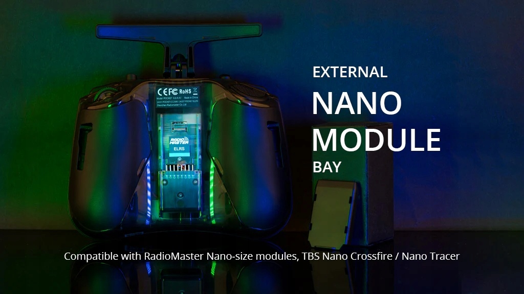 - - Слот для внешнего модуля, совместимый с модулями размера Nano от RadioMaster и TBS Nano Crossfire/Nano Tracer.