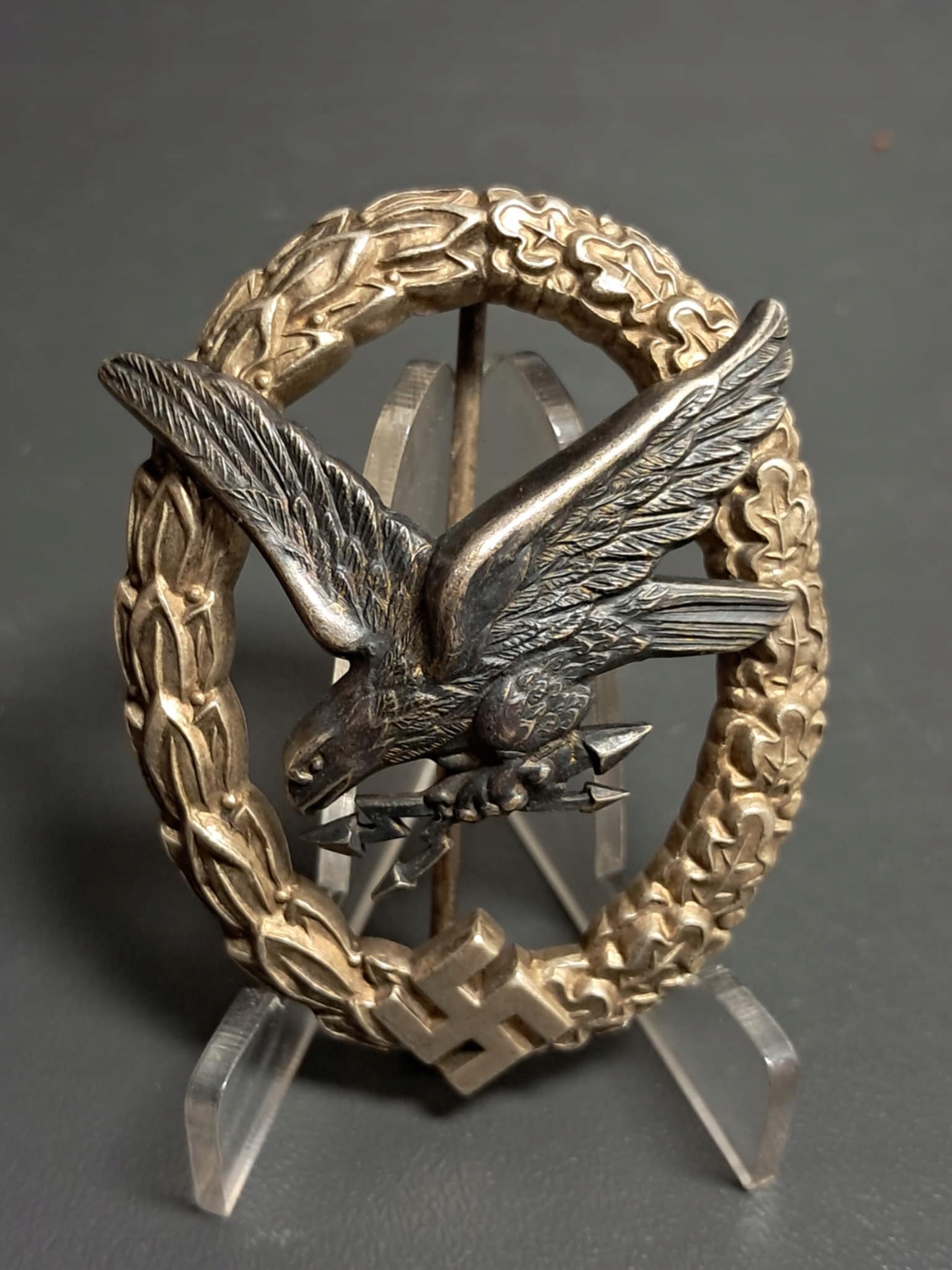 был основан 19 января 1935 года Германом Гёринг. Первоначально он был предоставлен авиационным сотрудникам, выполняющим функции радио операторов, стрелков на доске и воздушной механики, по крайней мере, через год с начала необходимого обучения. Значок имеет овальную форму, слегка выпуклый и окружен серебряным венком лавровых и дубовых листьев, с свастикой у основания венка. В центральной части значка есть орел, держащий два креста с молнией в когтях.