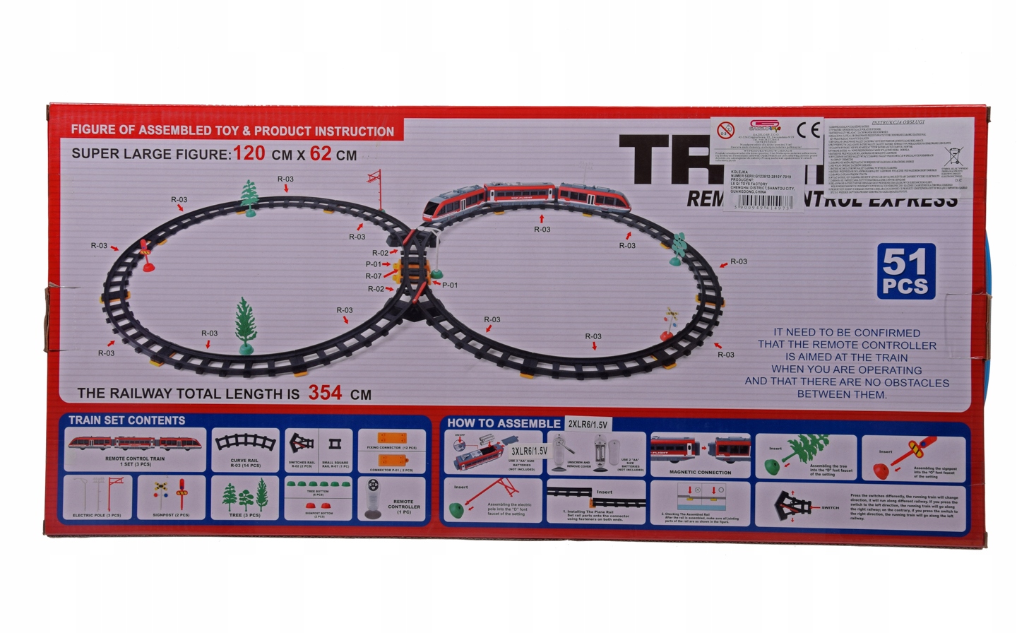 Комплект состоит из 52 элементов, общая длина дорожки 354 см. Поезд управляется с помощью пульта дистанционного управления, направление движения вперед и назад. Гусеницы имеют характерный и простой способ соединения, благодаря почему они безопасны и долговечны в использовании. Поезд и вагон изготовлены из пластика высочайшего качества, что обеспечивает долговечность и долговечность отдельных элементов комплекта. Игрушка имеет звуковые функции (звук движения) и световые функции. Пульт ДУ имеет присоску, что облегчает управление комплектом. и приятнее.