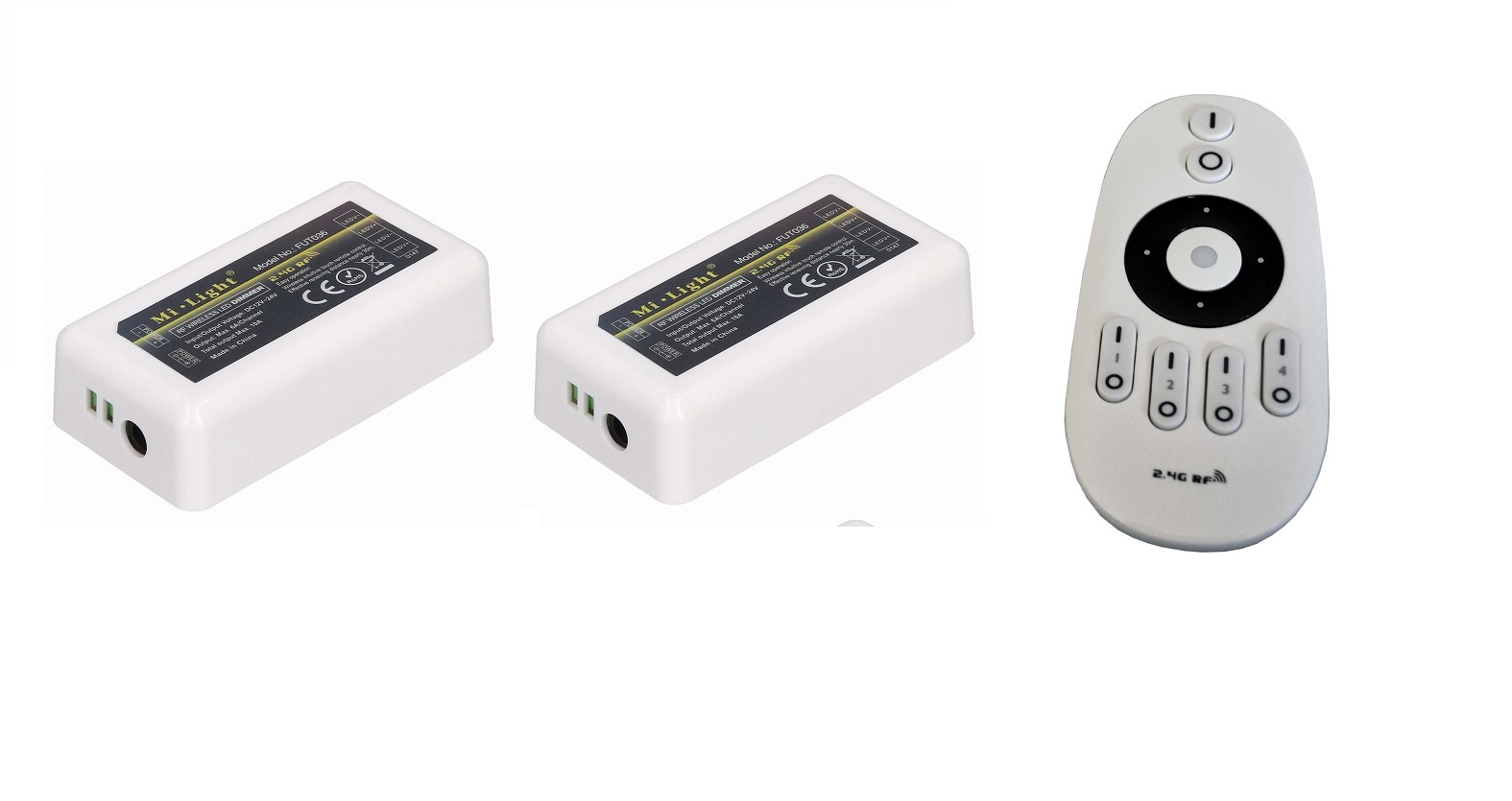 Два зонных приемника MiLight + 4-зонный пульт MiLight – изделия, сочетающие в себе современность и практичные решения в области управления светодиодным освещением. Комплект из двух зонных приемников и одного четырехзонного пульта позволяет управлять двумя независимыми. секции одноцветной светодиодной ленты. С помощью пульта можно включать/выключать, затемнять или увеличивать яркость каждого отдельного участка светодиодной ленты или всех сразу. Предлагаемый комплект позволяет управлять светодиодным освещением во всем доме с помощью одного пульта.
