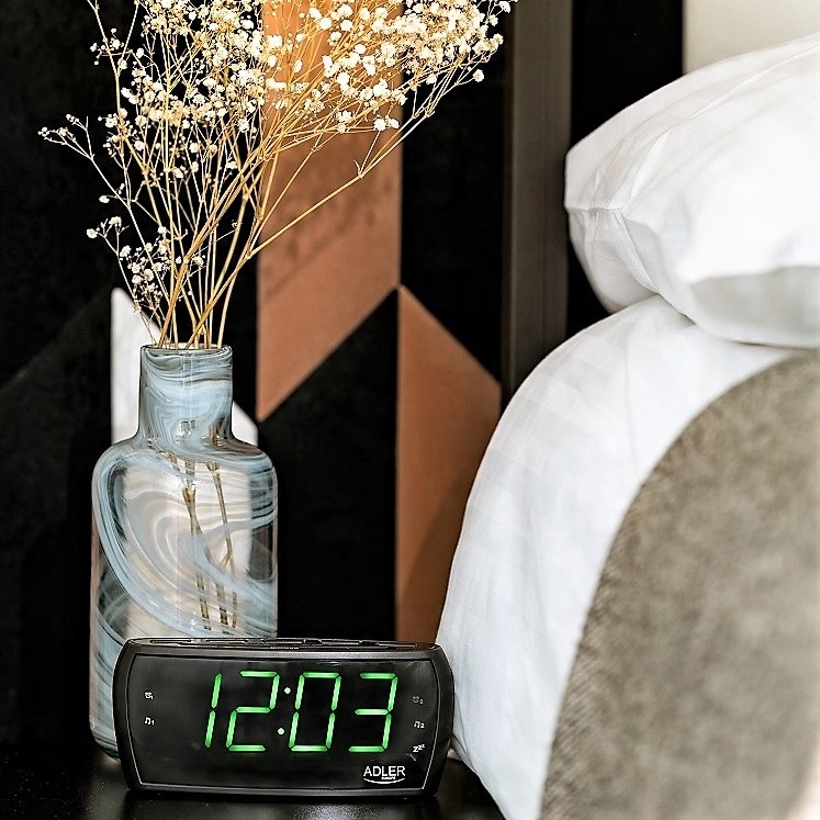 Эстетичные и функциональные радиочасы AD1121 от ADLER. Он принимает волны FM/AM и может разбудить вас как включением выбранной радиостанции, так и использованием выбранной мелодии звонка. Показанное время отлично видно благодаря светодиодному дисплею и цифрам высотой почти 5 см. Радиочасы питаются от сети, а также имеют встроенный аккумулятор для резервного питания памяти. Изделие, несмотря на мощный динамик и большой дисплей, весит менее 500 г, что позволяет очень легко брать его с собой в путешествие.