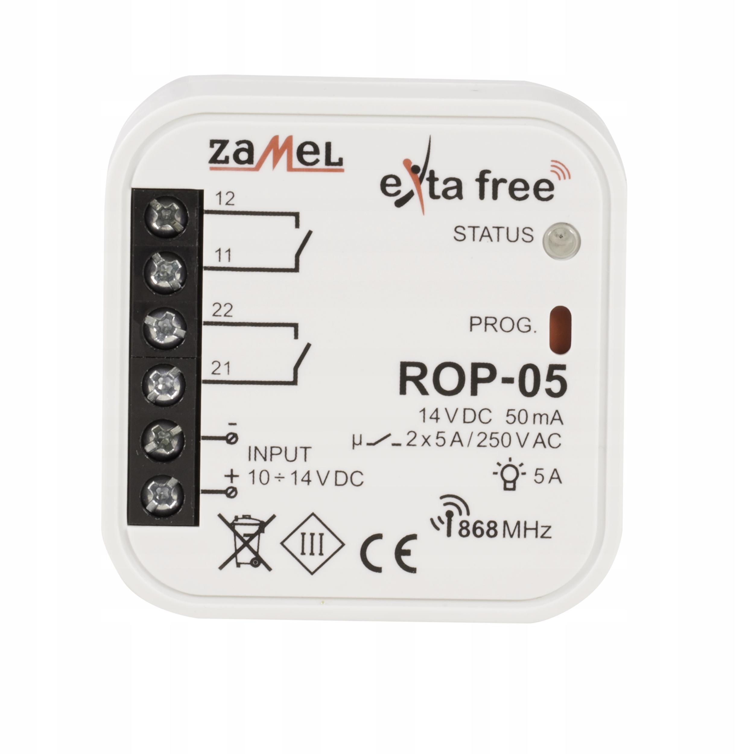 Приемник ROP-05 предназначен для выполнения простых функций управления в установках с низким напряжением 10 ÷ 14 В постоянного тока. В сочетании с бесплатными передатчиками EXTA он позволяет реализовать функцию приложения/отключения, моностабильный, бистабильный и временный режим. Приемник рекомендуется сотрудничать с диодным освещением.