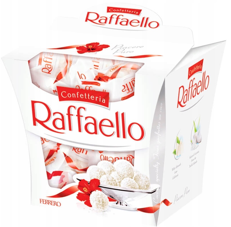 Рафаэлло – кокосовое лакомство из хрустящей вафли с миндалем внутри бархатистого крема. Все это завернуто в нежную кокосовую стружку. Коробка шоколада Raffaello 150г – это элегантная упаковка с хрустящими вафельными шариками, бархатистой начинкой и миндалем, посыпанным кокосовой стружкой.