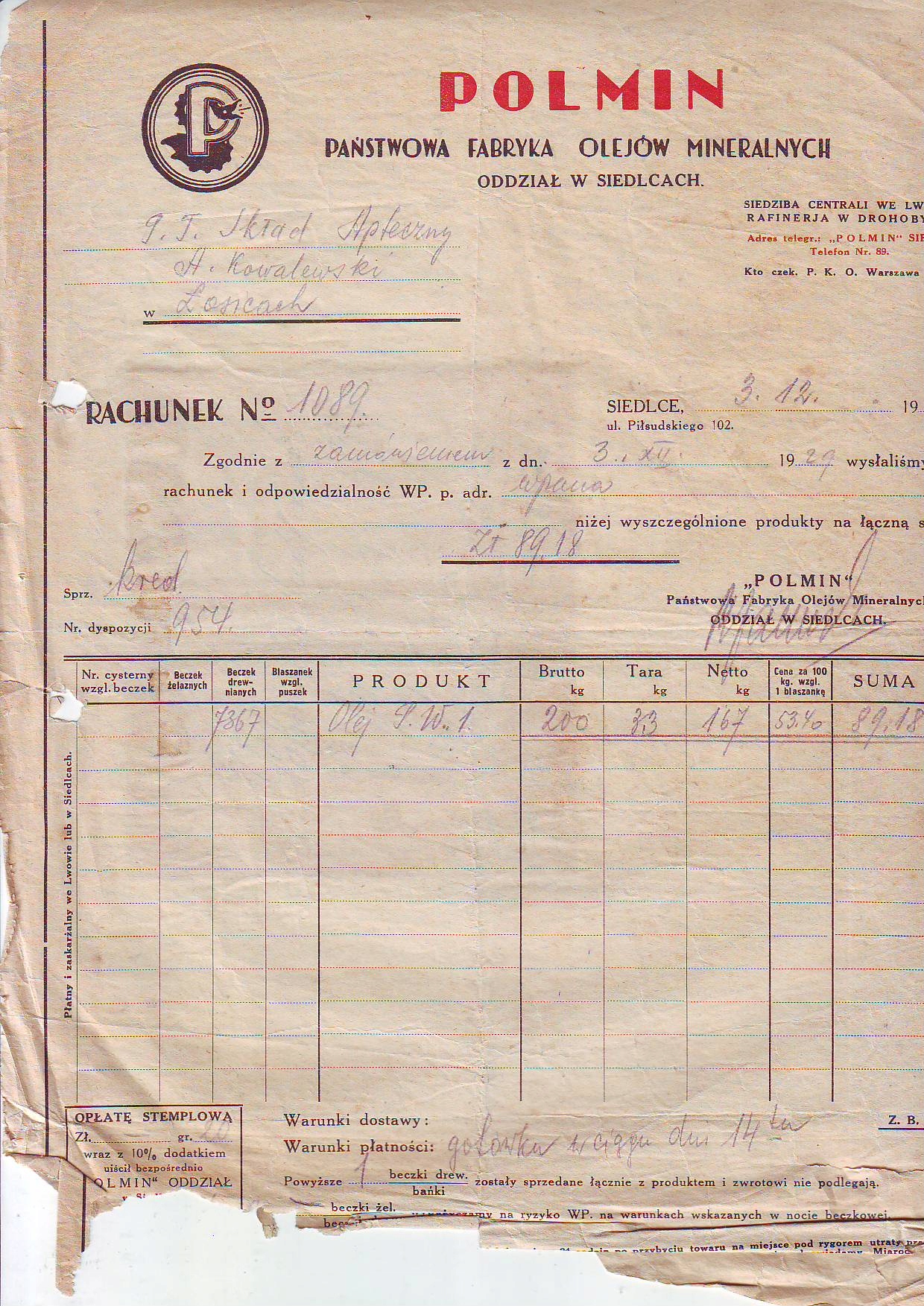 Нефтяная накладная, ПОЛМИН 1929 г., Седльце