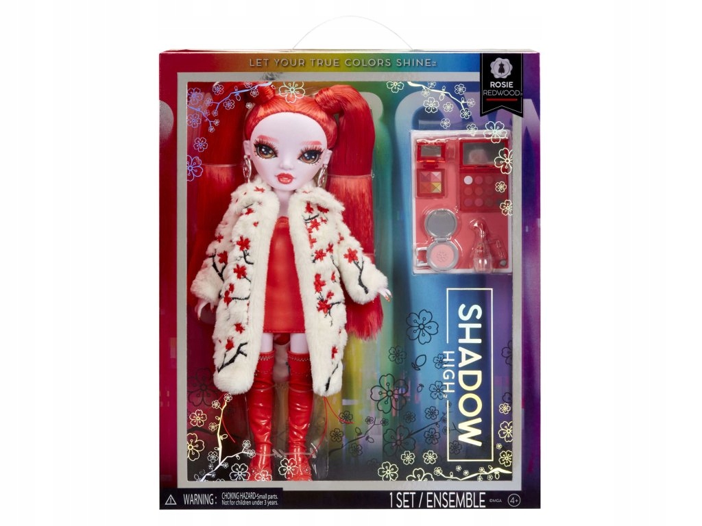 В Shadow High All Study Creative. Рози Редвуд увлечена визой и любит проверять макияж на себя и своих друзей - у него есть квадратный косметолог, покрасневший на щеки и тени для век. Рози Редвуд одета в ярко -красное - ее стиль подчеркивается красным платьем, белым искусственным мехом, туфлями на колене и большой серьги. Ее рыжие волосы расположены в 2 длинном хвостике и имеют длинные ресницы и стеклянные глаза.