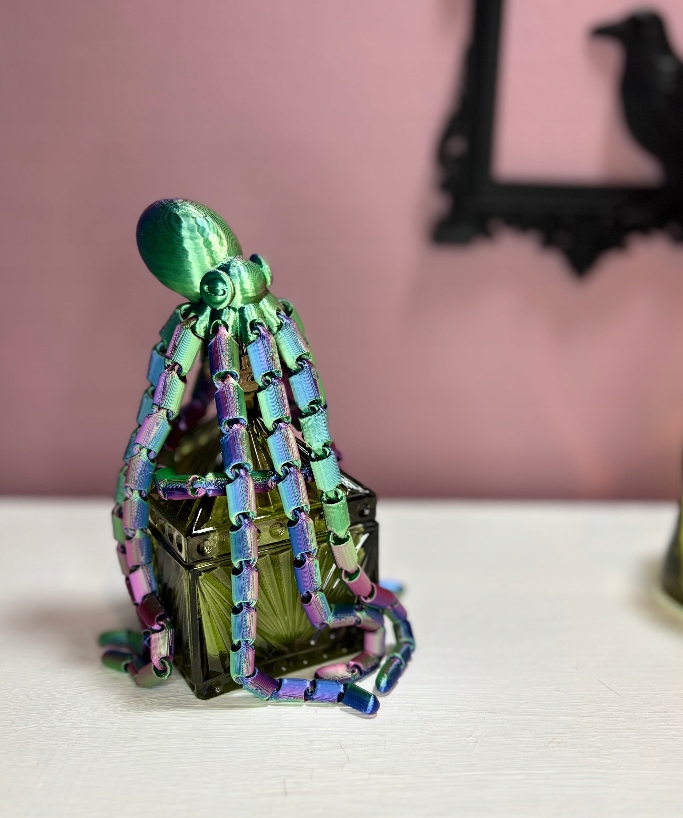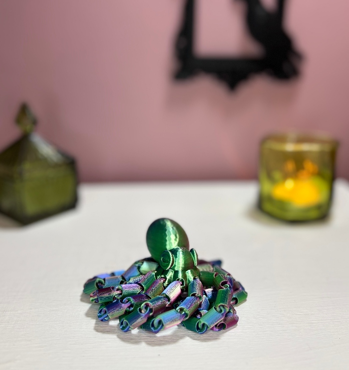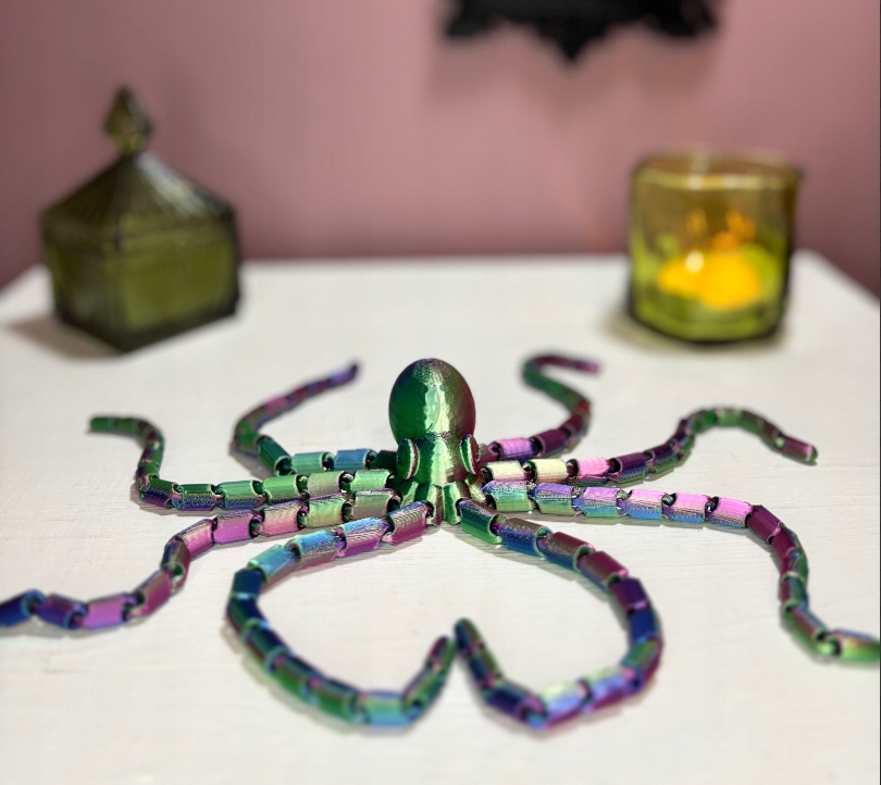 Восхитительный гибкий осьминог, напечатанный с помощью 3D-технологии с использованием высококачественной нити с металлически-радужным покрытием.