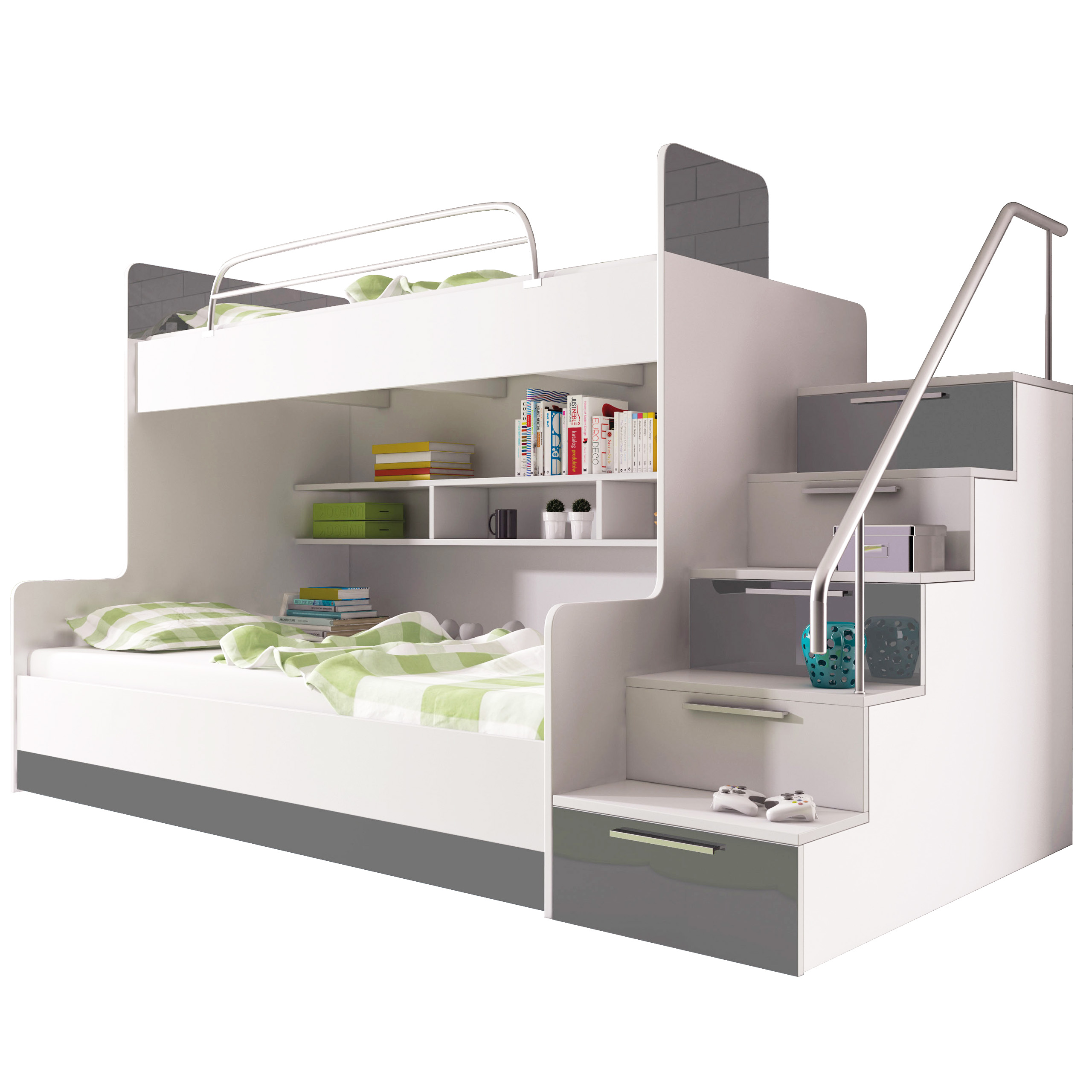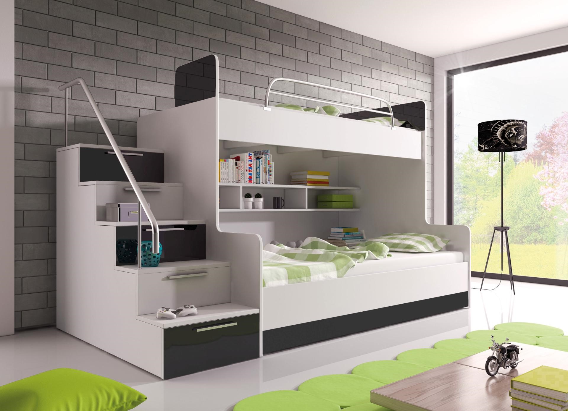 Кровать отличается современным дизайном и точным исполнением, обеспечивающим исключительно хороший сон и гарантию безопасности и уверенности в том, что ваш ребенок проснется отдохнувшим. Фасады гарнитура выполнены из глянцевого мебельного МДФ насыщенных цветов, что позволит подобрать мебель к любому помещению. Верхняя спальная поверхность и ступеньки рядом с кроватью оборудованы перилами, которые защитят ребенка от выпадения.