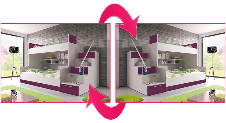 Ступени могут располагаться как с ЛЕВОЙ, так и с ПРАВОЙ стороны кровати (после покупки уточняйте вариант ступеней)
