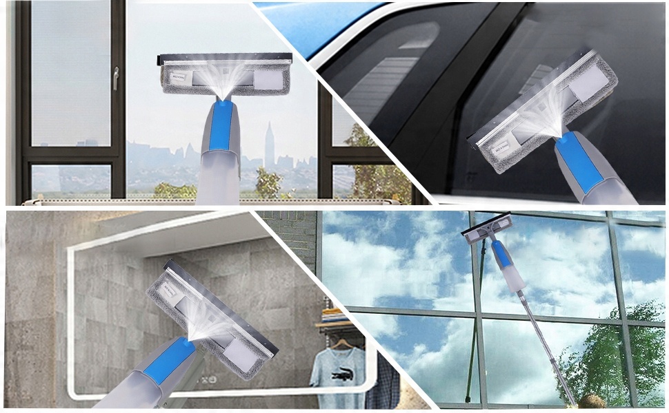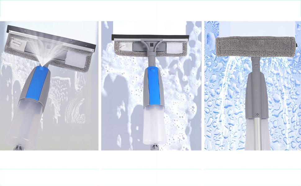 💧 Распылитель с бутылкой: Стиральная головка оснащена бутылочкой — наполните ее водой или моющим средством и опрыскайте окна с помощью кнопки на ручке.
