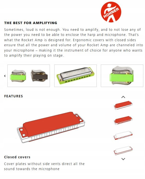 Harmonica Rocket Amp представляет новый путь среди диатонических гармоний. Эргономичное тело с сглаженным и округлым краями дает нам максимальный комфорт. Горизонтальные выхлопные отверстия и новый дизайн канала дают нам наибольший объем. Гармоника немецкого производства.