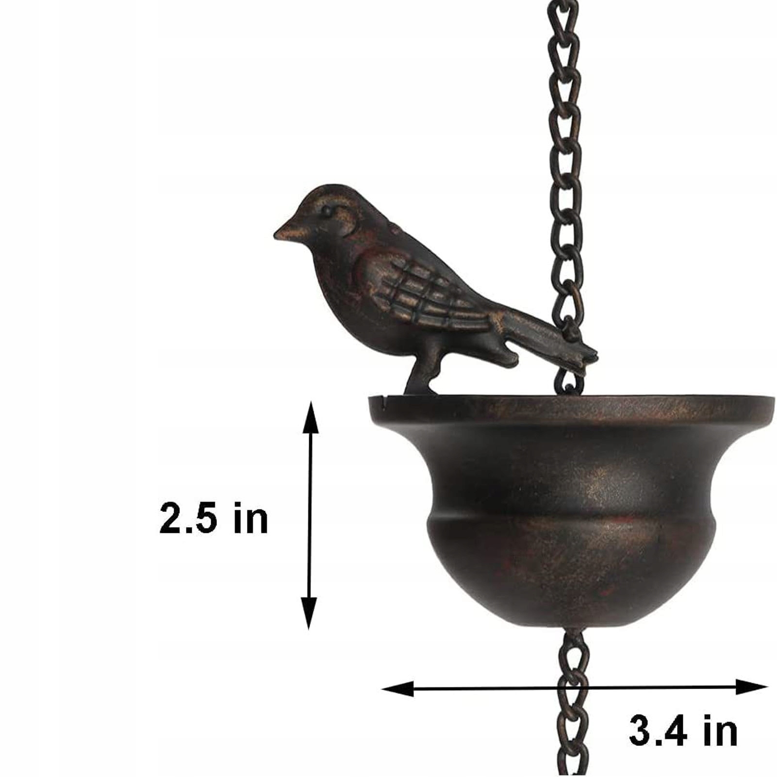Особенность: ✅1. Достаточная длина: эта дождевая цепь имеет длину 50 дюймов, движущихся птиц диаметром 3,4 дюйма и 8 чаш, которые заметно направляют дождевую воду вдоль цепи и собирают ее в ведра, бочки или аэрозольные баллончики.
