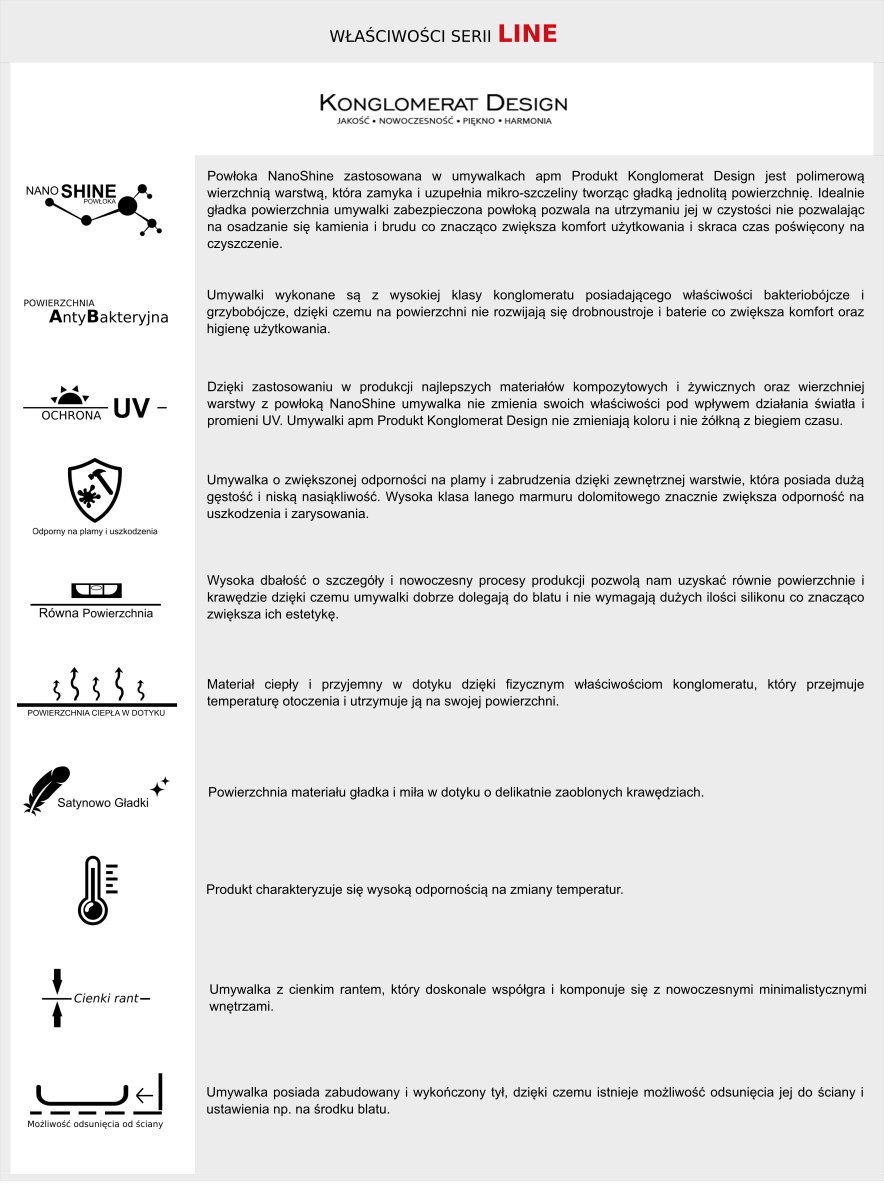 При производстве использовался высококачественный конгломерат и смолы, поэтому, несмотря на Благодаря небольшому весу умывальник очень прочный и идеально подходит для повседневного использования. Умывальник предназначен для установки на столешницу или шкаф в заранее подготовленное отверстие. В комплект входит встроенный перелив в глянцевом хромированном исполнении. Отверстие под смеситель диаметром 3,5 см и сифон 4,5 см, стандартизированные для соответствия 99% сифонов и кранов, доступных на польском рынке.