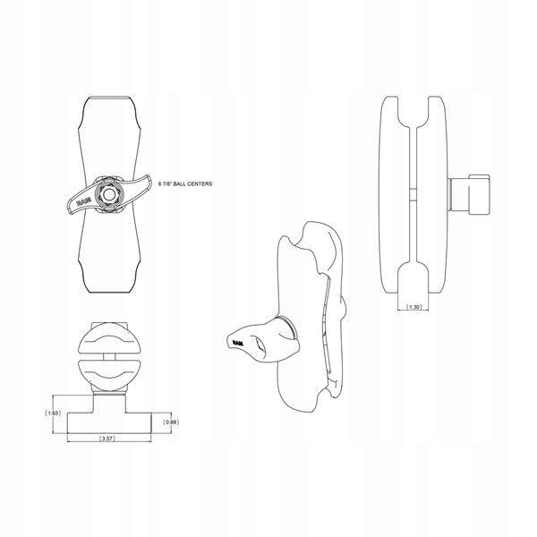 Стандартный кронштейн RAM-D-201U с двумя гнездами стандартного размера имеет гнезда на обоих концах, в которые можно устанавливать шарики диаметром 2,25 дюйма. Единственная пружина внутри рычага открывает концевые гнезда, позволяя шару вращаться и гнездовым соединениям. Эта технология разъемов обеспечивает практически бесконечную регулировку и отличные углы обзора.