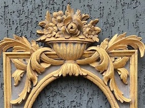 Стильная прямоугольная рама с овальным светильником, вырезанная из твердой древесины первой половины 20 века. Орнаменты вырезаны в вертикальном расположении с вазой для цветов, увенчанной в стиле барокко. Все это позолочено металлом и окрашено в коричневые и серые оттенки. Полихромия после ремонта. Незначительные повреждения и царапины добавляют характера. В комплект входит оригинальный металлический кулон. Изначально рама, скорее всего, предназначалась для обрамления зеркала в женском кабинете.
