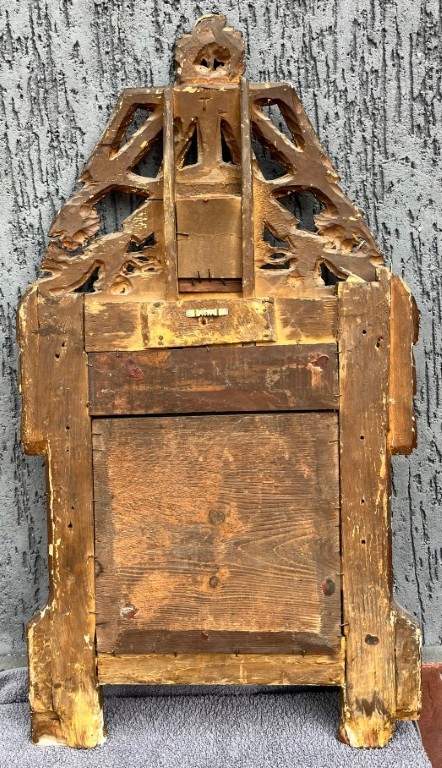 Стильная рама с короной с зеркалом, с трудом вырезанным в лиственной древесине с конца 18 -го века. Вырезанные украшения в стиле позднего классицизма (период режиссера). Целое позолочено золотом и приятелем на красном пульме. Оригинальный полихром, без перекраски. Корона добавлена на деревянные планки. Красивое овальное окно с зеркалом. Все оригинальное с эпохи. Защита от позолота, повреждения и царапин, оправданных возрастом объекта. Металлический кулон включен.
