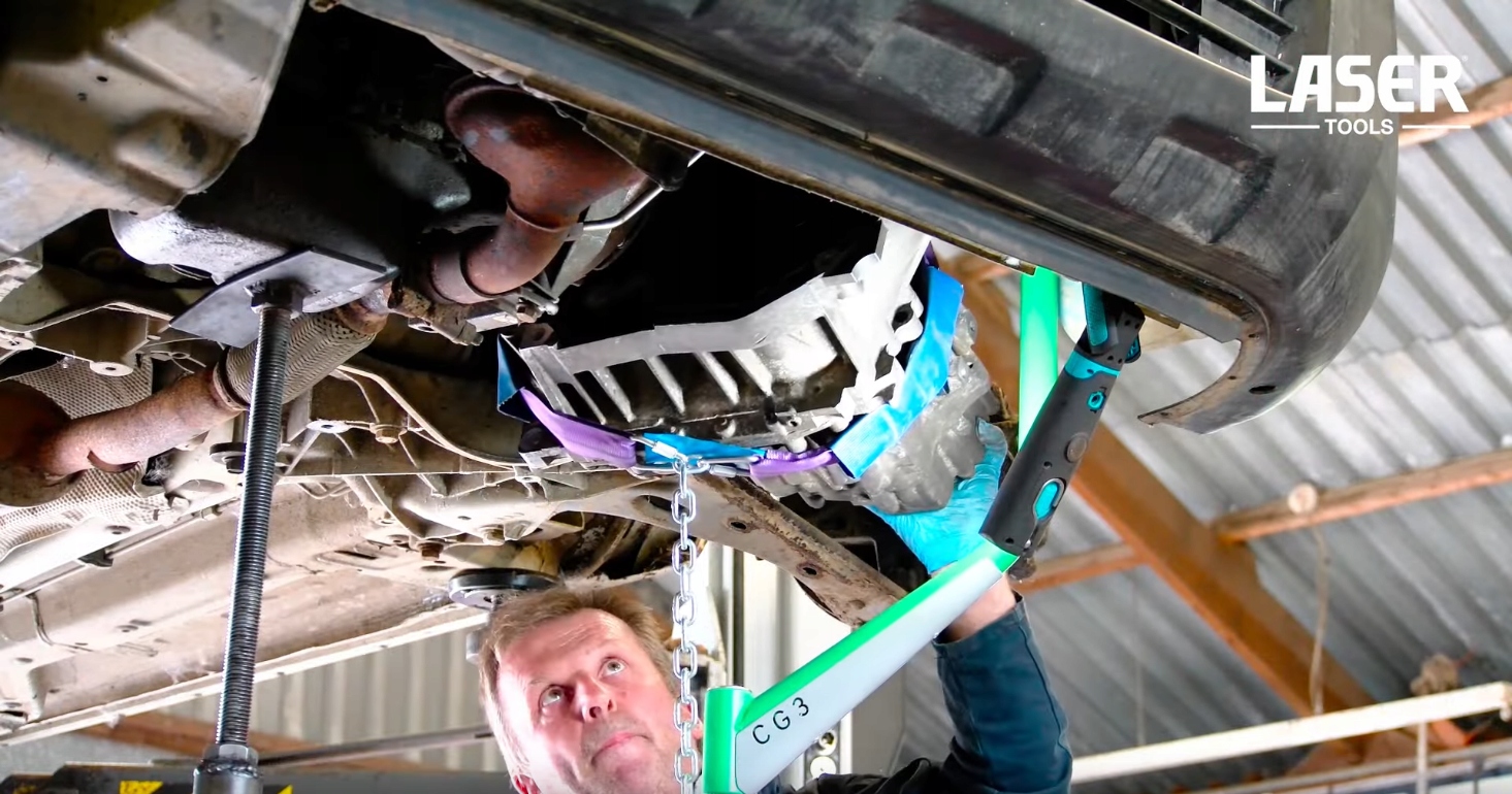 Лазерные инструменты №8579 упрощают снятие и установку трансмиссии, поддерживая трансмиссию сверху. Это достигается путем присоединения к традиционному вертикальному подъемнику коробки передач и наличия рычага специальной формы, который поднимается вверх по боковой части коробки передач и служит точкой крепления для подвешивания прилагаемого ремня и цепей.