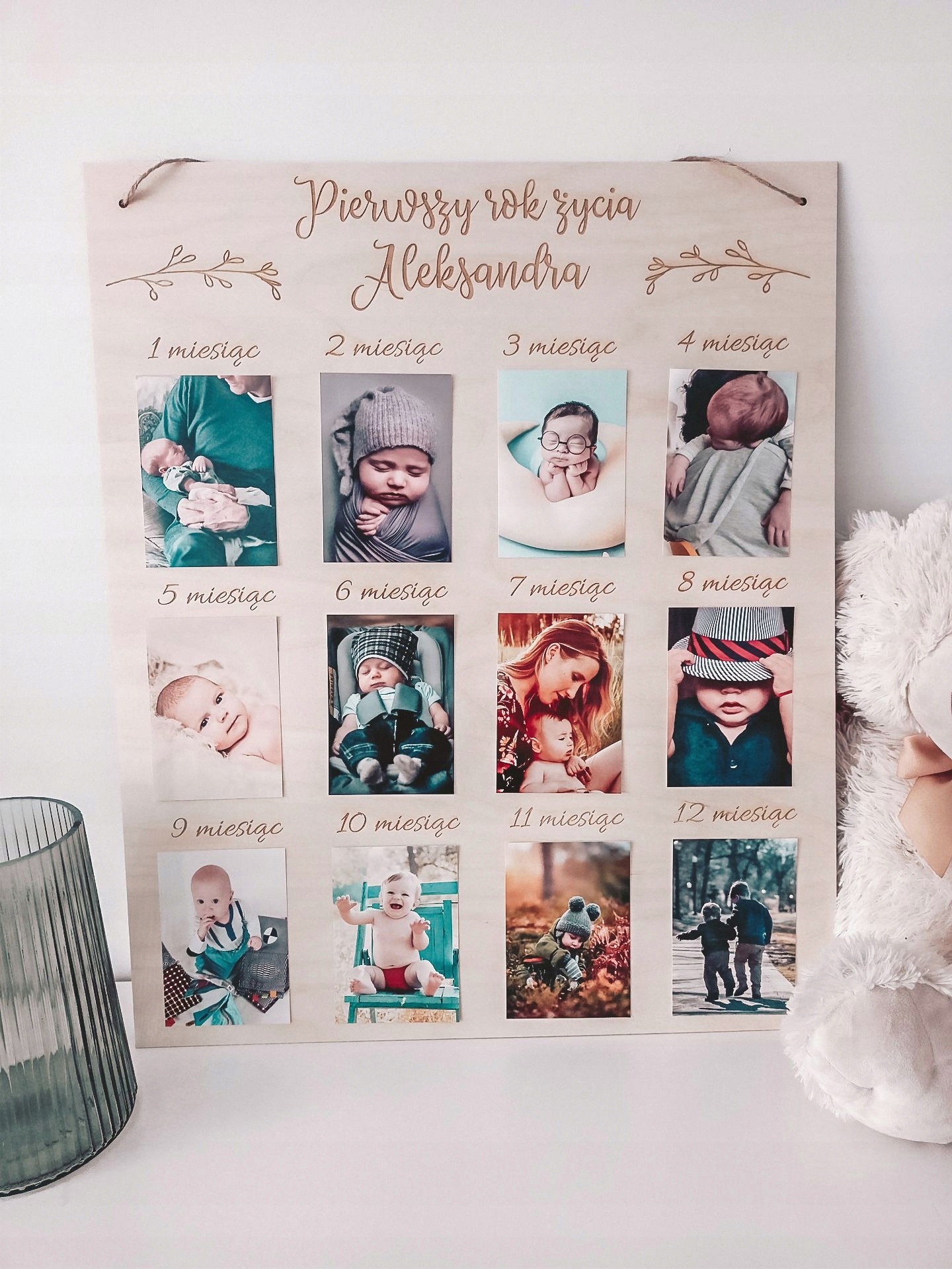 Вы ищете уникальный сувенир с первого года жизни ребенка? Наша Деревянная табличка с пространством для фотографий является идеальным предложением для подарка в течение одного года или украшения для 1 -го дня рождения - красиво, естественно и полна настроений. Запечатлеть самые важные моменты из 12 месяцев жизни ребенка на одной доске, которые порадуют всех!