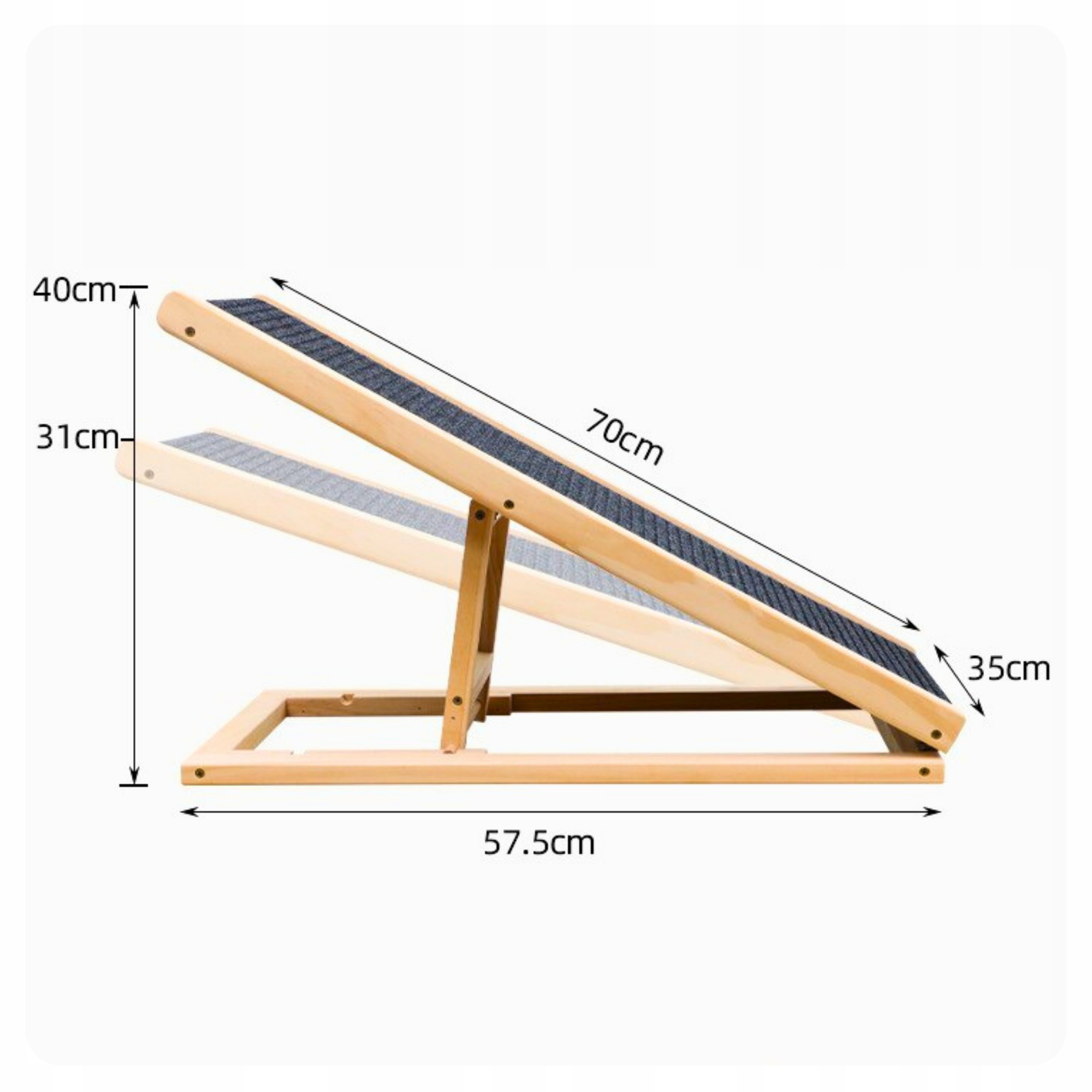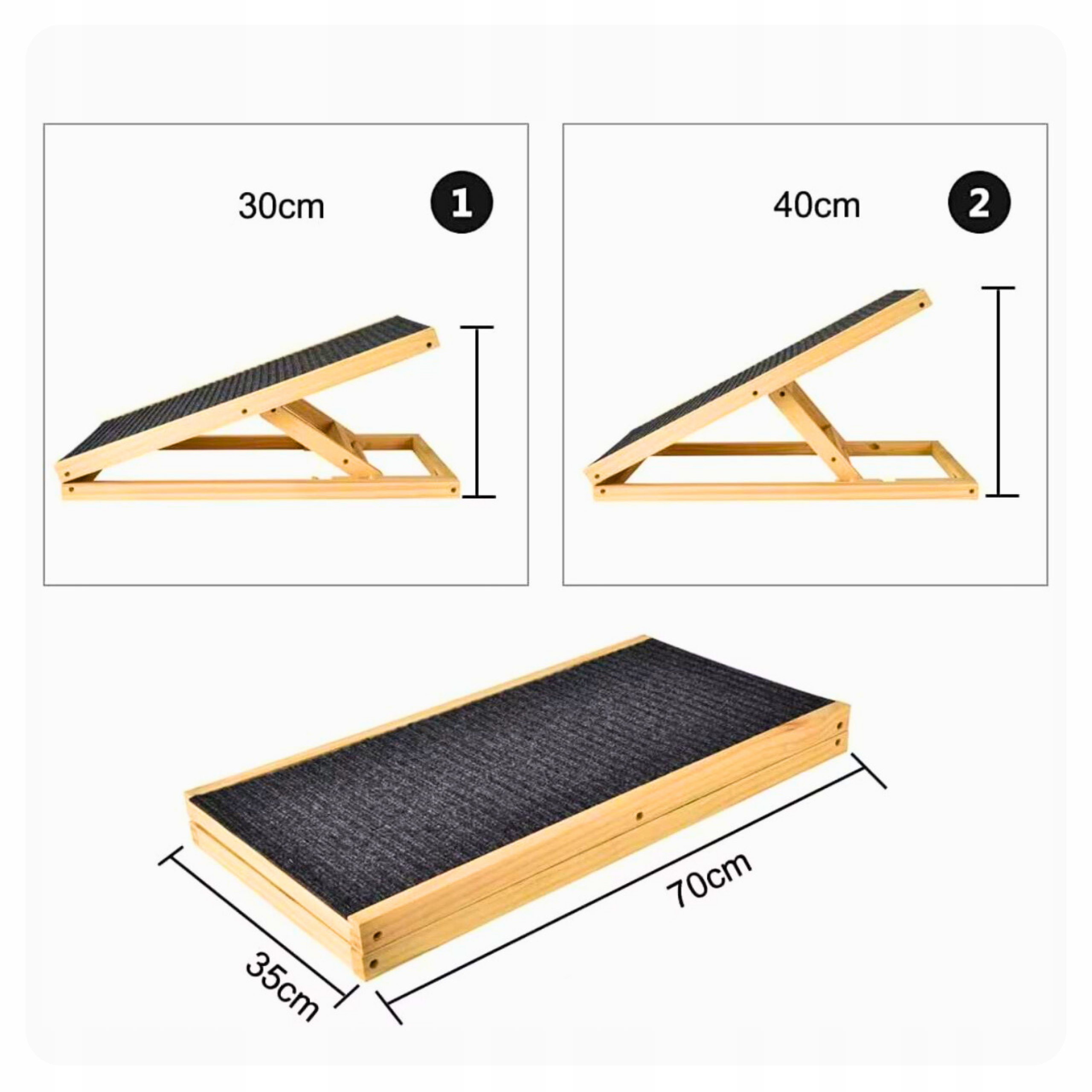 Наш регулируемый деревянный пандус — идеальное решение как для молодых, так и для старых или больных животных, которым трудно подниматься на высоту. Благодаря двум уровням регулировки его можно легко подогнать под любой диван, кресло или багажник автомобиля. Прочная конструкция из массива дерева обеспечивает устойчивость, а нескользящее покрытие придает вашему питомцу уверенность при каждом шаге. Пандус полностью складной, поэтому после использования его можно легко спрятать под диван или за шкаф. Это практичная, прочная и безопасная опора, которая обязательно понравится вашему питомцу!