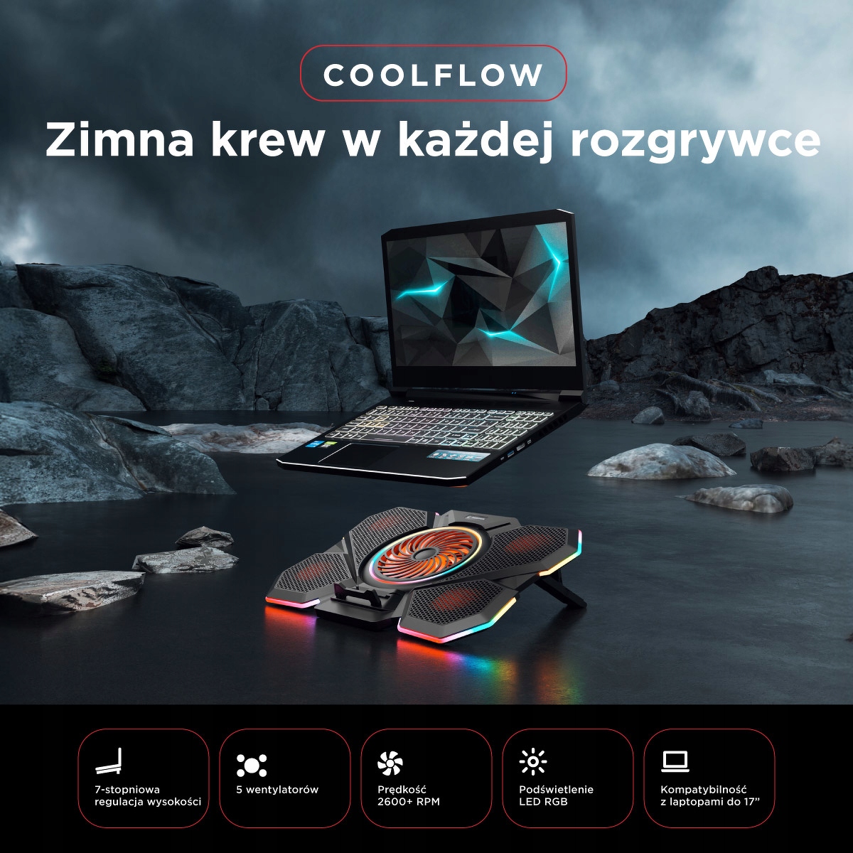 Rampage S47 CoolFlow – подставка для ноутбука с 5 вентиляторами, USB, RGB-подсветкой и 7-ступенчатой регулировкой по высоте. Играйте круто, играйте усердно.