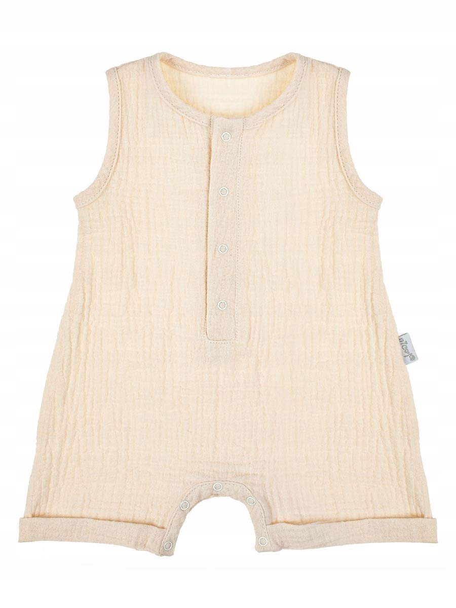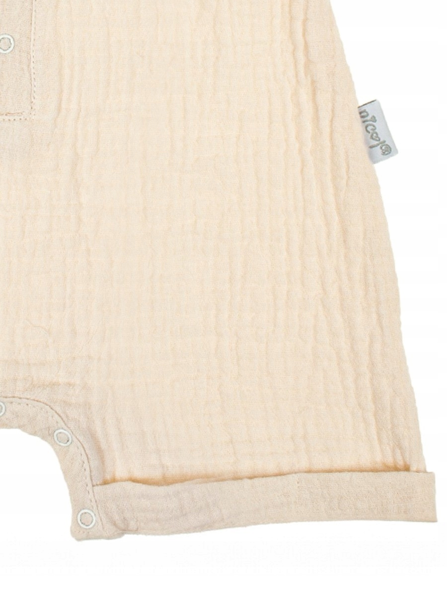 Бежевый муслиновый комбинезон для мальчика из воздушной ткани. Его состав – 100% хлопок. Свободный крой, очень удобный. Передняя часть декорирована застежкой типа «поло» и подвернутыми ножками. Застегивается на удобные кнопки без никеля спереди и в области промежности. Это облегчит одевание ребенка. Нежность и воздушность продукта идеальны для жарких дней.