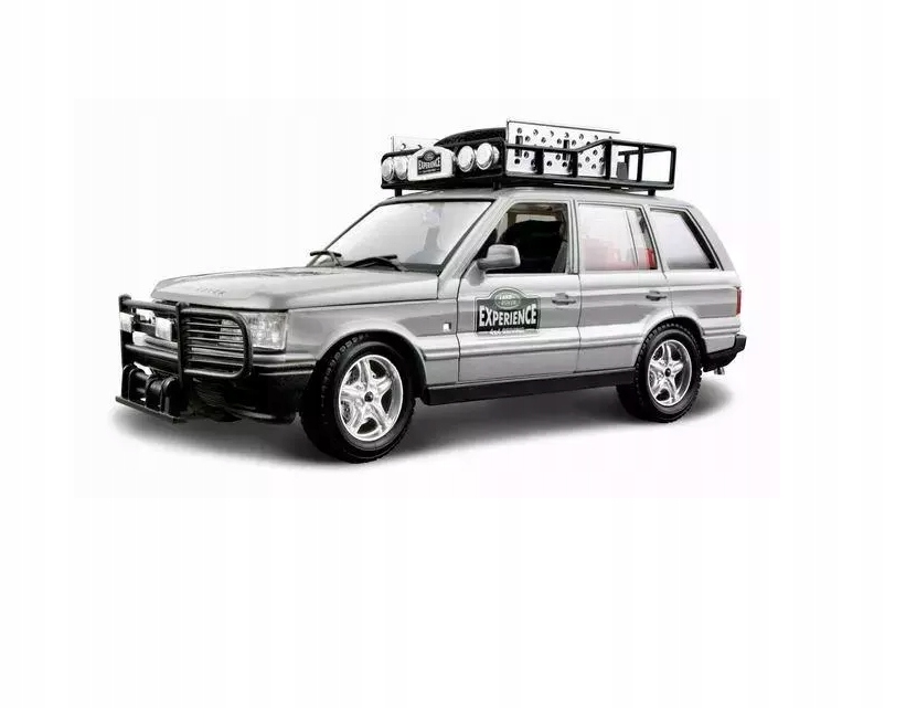 Модель Range Rover из коллекции Bburago представляет собой металлическую модель с пластиковыми элементами для самостоятельной сборки. Автомобиль сохранен в масштабе 1:24, кузов серебристого цвета, открывающиеся двери, колеса поворачиваются при движении руля.