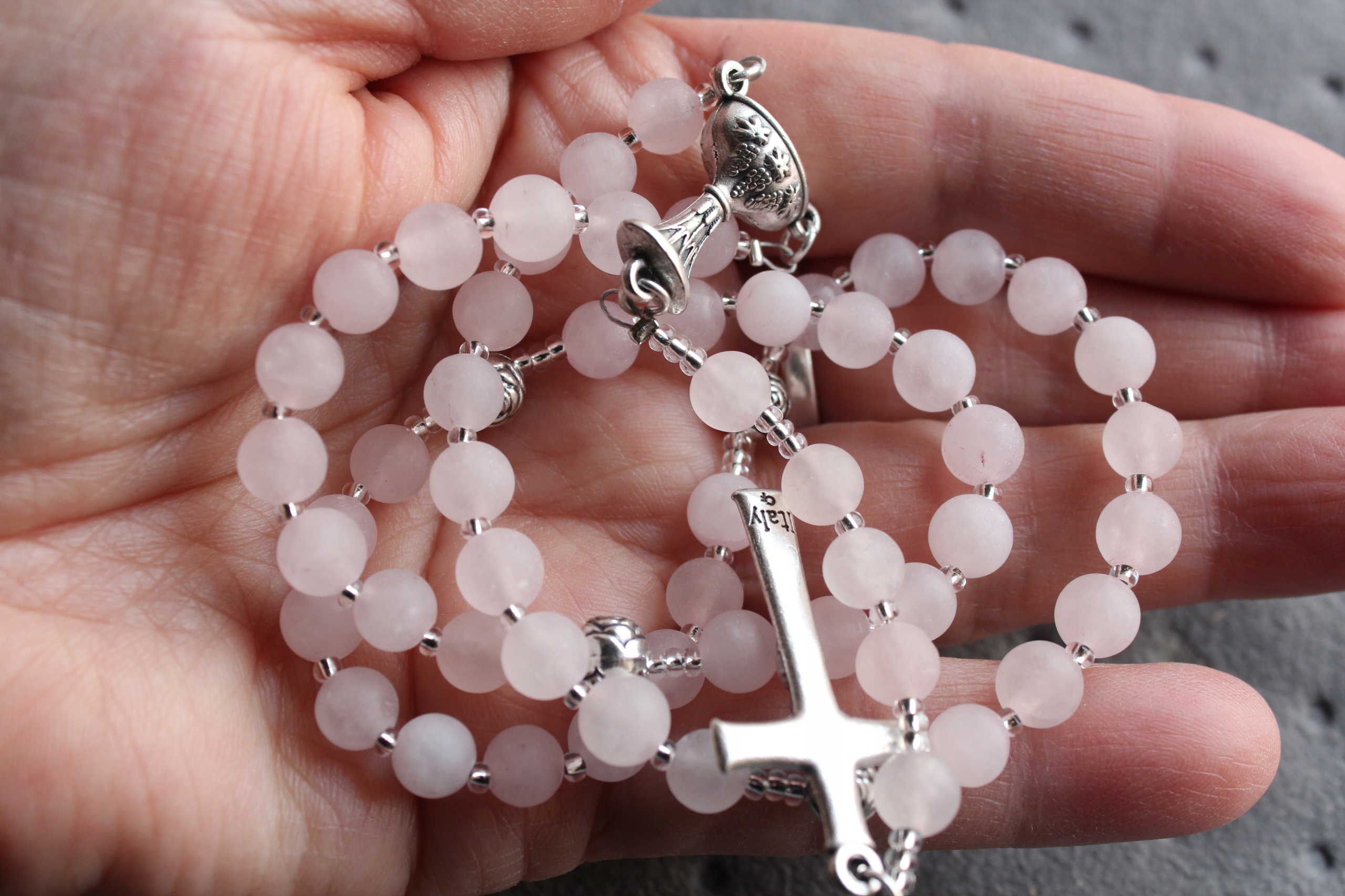 Różaniec Komunijny Komunia z kamieni kwarc różowy + etui Kielich IHS