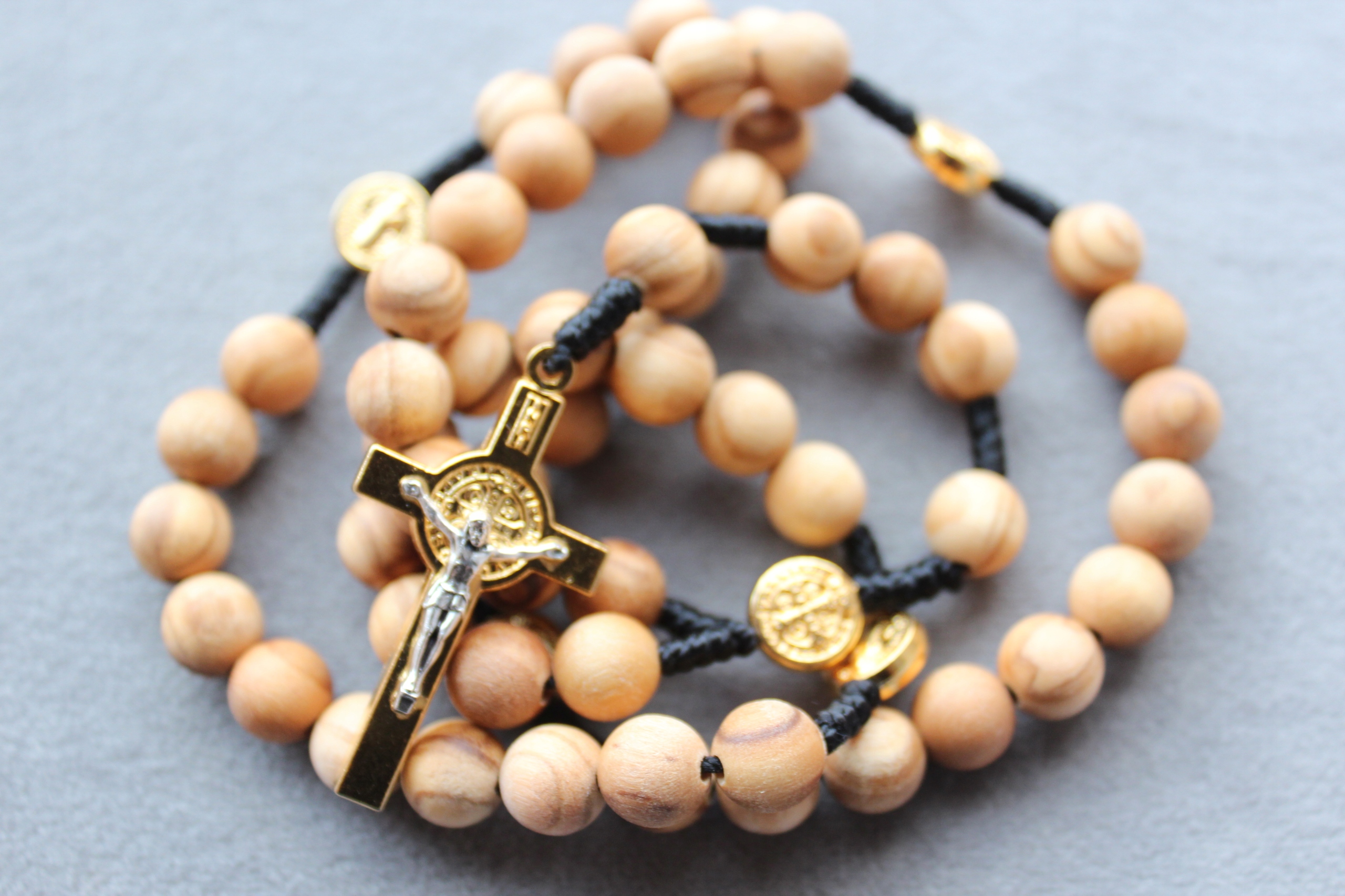 Różaniec sznurkowy z drzewa oliwnego Krzyż i Medaliki Św. Benedykta