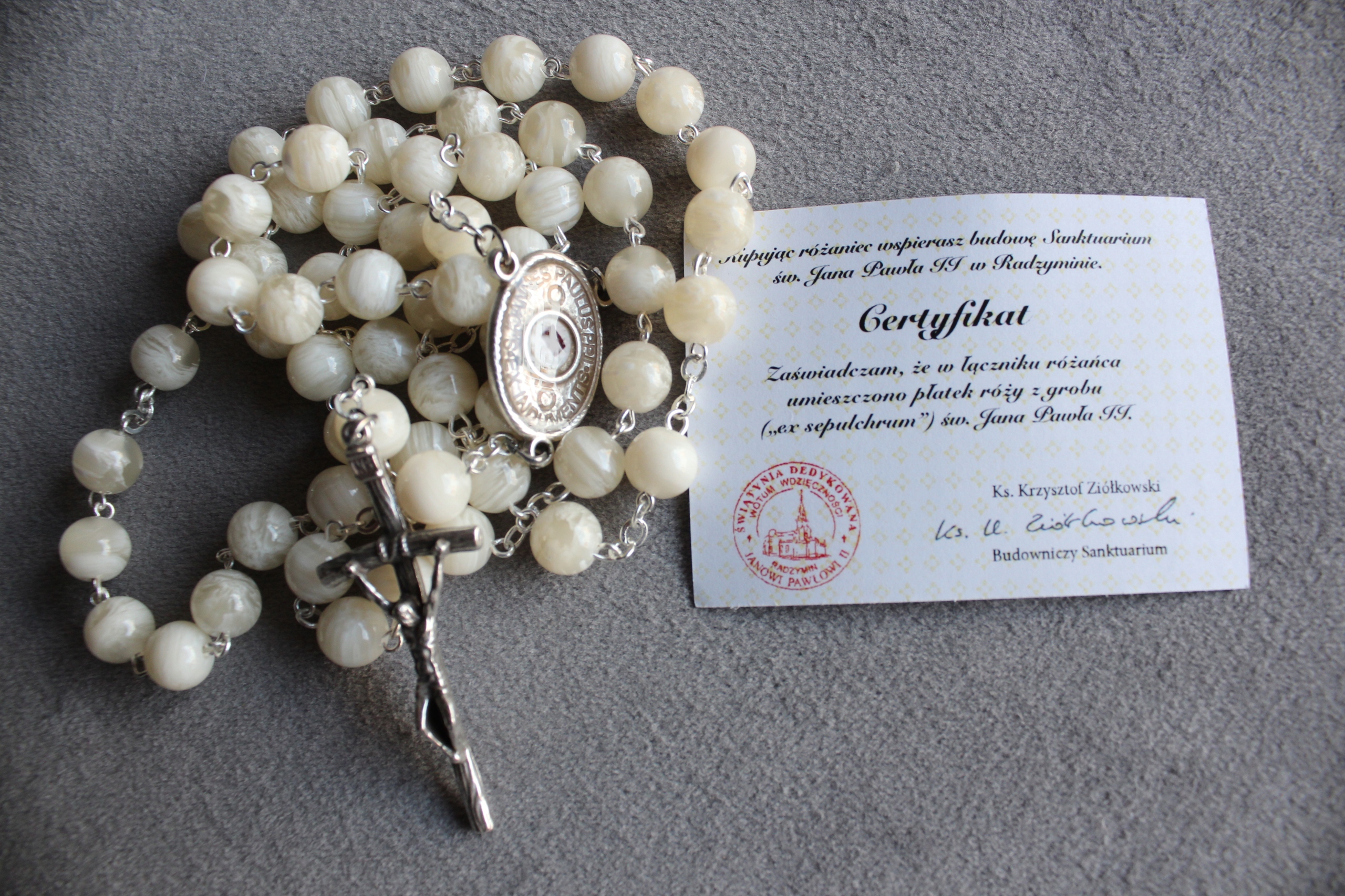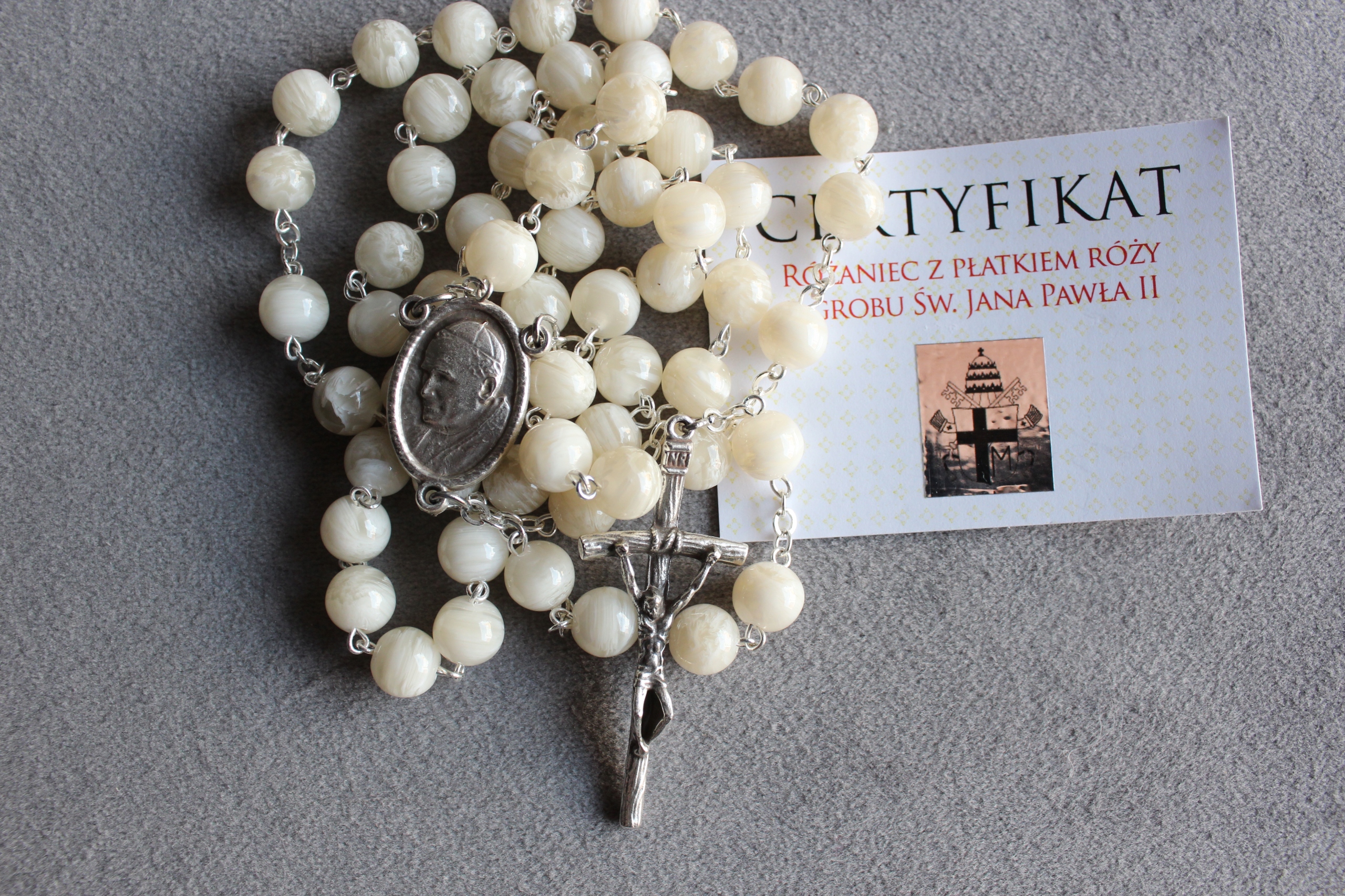 Różaniec z płatkiem róży z grobu św. Jana Pawła II