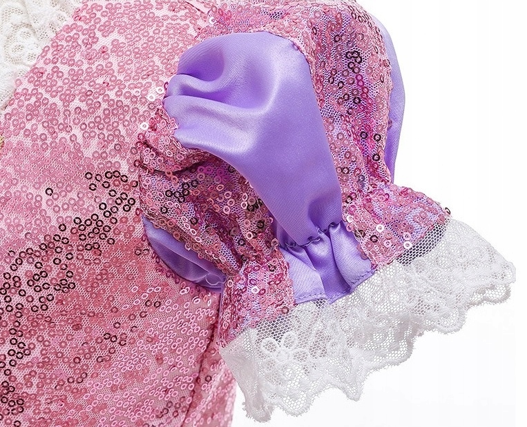 - Красивое платье в стиле Рапунцель. Выполнено из блестящего атласного материала фиолетовых и розовых оттенков.