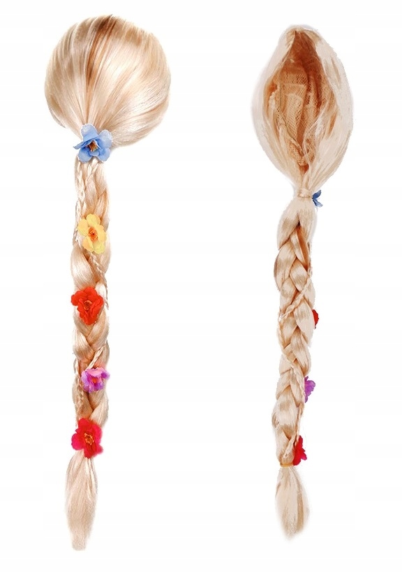 - Парик блонд с длинной косой, украшенной яркими цветами,