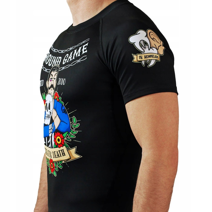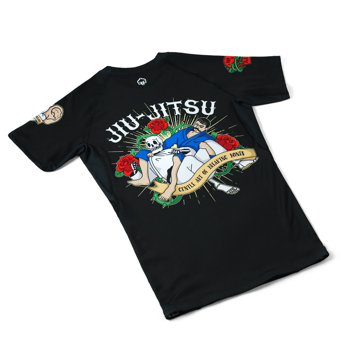 Настоящее удовольствие для любителей татуировок старой школы. Однако вместо популярных якорей, роз или ласточек вы встретите мотивы, отсылающие к бразильскому джиу-джитсу. Мужской рашгард с короткими рукавами — идеальный выбор для тренировок по BJJ, MMA, CrossFit, в тренажерном зале или бега. Футболка обладает компрессионным эффектом и идеально прилегает к телу, обеспечивая полную свободу движений и защиту от царапин.