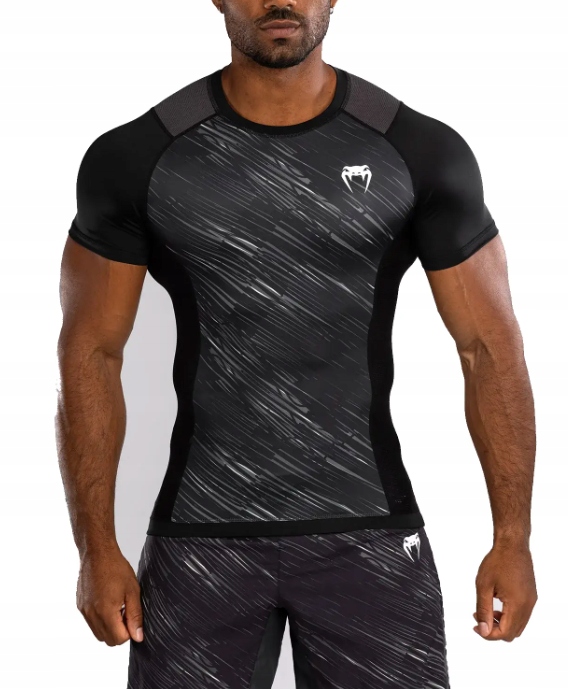 Рашгард Venum Rapid Black/Storm Grey с коротким рукавом обеспечивает защиту от травм и свободу движений во время борьбы.