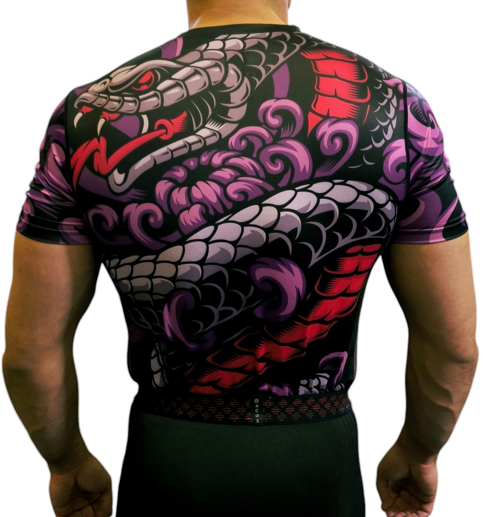 <р> Изготовленный из высококачественного материала, сочетающего полиэстер и эластан, он обеспечивает отличную компрессию и свободу движений во время интенсивных тренировок. <р> Короткие рукава, дышащая ткань и эластичность материала гарантируют комфорт и поддержку. <р> На спине характерный принт в виде змеи – символ ловкости и силы, – который придает рашгарду неповторимый характер.