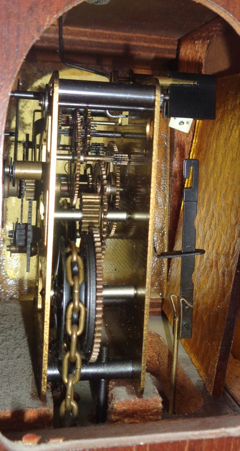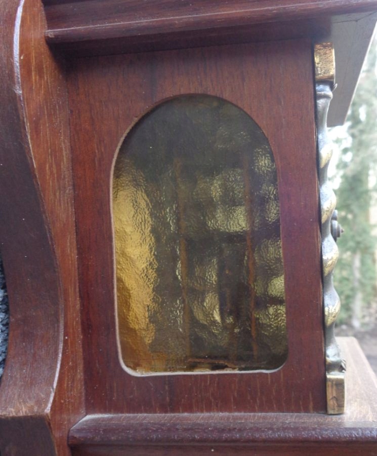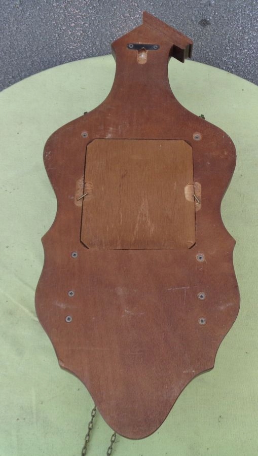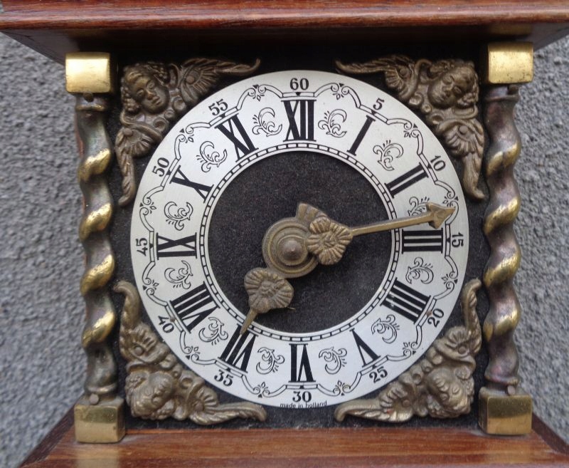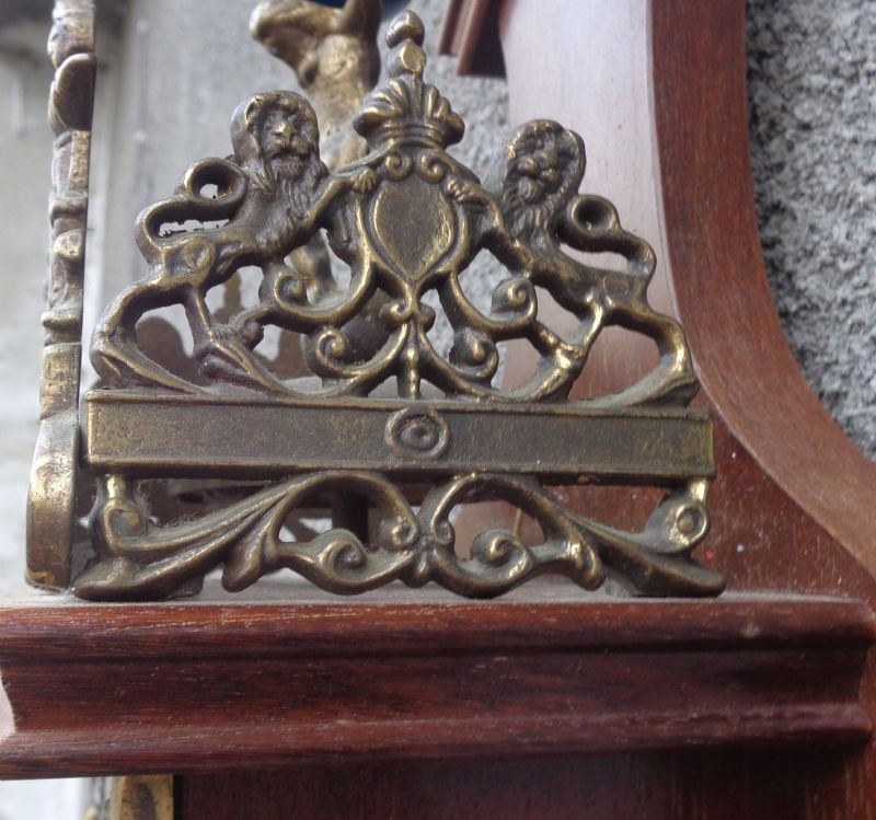 Интересные, богато декорированные подвесные часы в голландском стиле 1970-х годов. У часов деревянная верхняя часть, отсутствует одна деревянная полоска. Верх часов украшен интересными латунными вставками. Три латунные вставки украшены интересным орнаментом в виде грифонов и различных фигурок. Вставки также украшены интересным орнаментом из лент. Самая крупная из вставок дополнительно украшена надписью. На самом верху также находится латунная фигурка атласа, к которому прикреплен колокольчик. Часы имеют красивый циферблат с богато украшенными латунными стрелками, римскими часовыми и арабскими минутными указателями. Циферблат имеет латунные бляшки по углам в виде амуров. По обеим сторонам расположены интересные латунные колонны. Внизу имеется богато декорированная латунная вставка. По бокам интересные деревянные вставки с латунными выступами. На выставке представлен оригинальный интересный латунный маятник и оригинальные весы. Механизм часов готов. Подходит для проверки и ввода в эксплуатацию часовщиком. На механизме и циферблате имеются подписи, которые видны на фотографиях. Экспонат имеет обе стеклянные вставки, которые расположены по бокам корпуса на высоте механизма. Всем рекомендую.