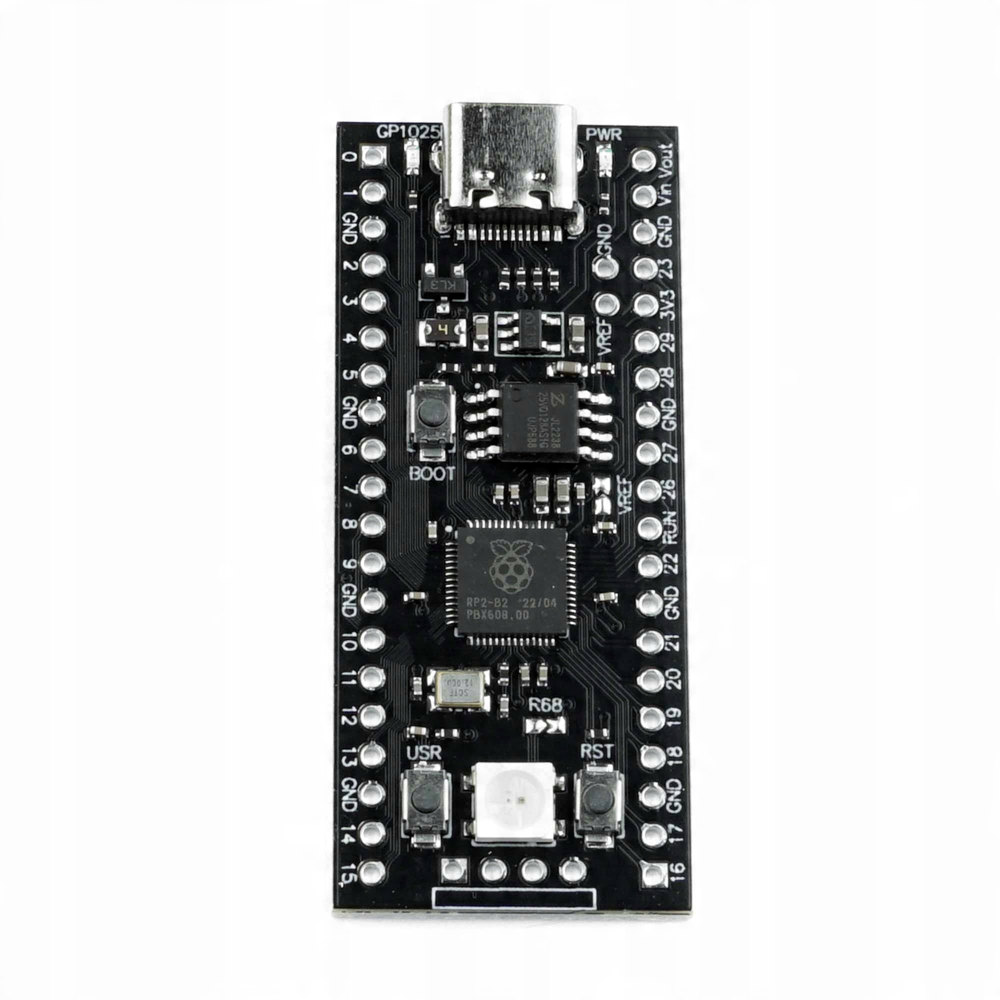 Микроконтроллер YD-RP2040, оснащенный системой Raspberry Pi RP2040, полностью совместим с Raspberry Pi Pico. Этот клон представляет собой улучшенную версию культовой платы, благодаря которой мы получаем до 8 раз больше FLASH-памяти, т.е. 16МБ вместо 2МБ, дополнительные кнопки: RESET и программируемую пользовательскую кнопку, встроенный RGB-светодиод WS2812 и разъем USB-C. вместо старого microUSB. Система RP2040 с двухъядерным процессором ARM Cortex-M0+ с тактовой частотой 133 МГц обеспечивает высокую производительность и энергоэффективность.