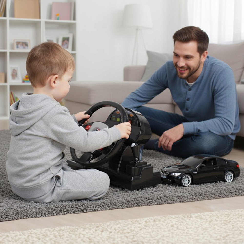 Управление осуществляется с помощью уникального пульта дистанционного управления в виде руля с присоской, который можно закрепить на ровной поверхности. Это решение обеспечивает полный контроль над автомобилем и реалистичные ощущения от вождения.