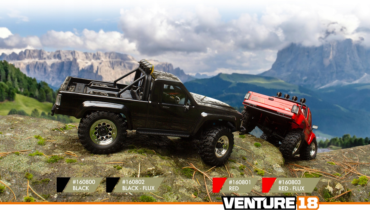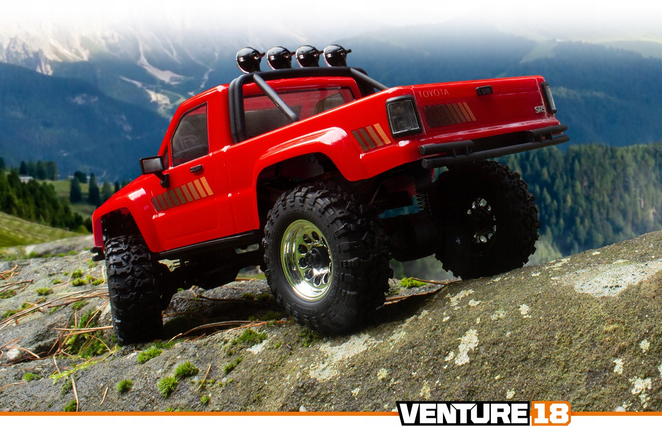 Venture18 также является возвращением официально лицензированных продуктов Toyota в предложение HPI Racing. Точно воспроизводимый тел Toyota Hilux SR5 с 1985 года, изготовленного из поликарбоната без использования клипов, доступен в двух выразительных цветах - блестящий черный и интенсивный красный с эффективным набором ремней. Тело -фабрично -пленка, имеет прозрачные окна и детали в масштабе, такие как эмблемы Toyota, передний гриль, дверные ручки, дворники, функциональные зеркала, а также бамперы и рулоны в стиле труб, что дает ему необычный реализм. Набор светодиодов дополнительно подчеркивает подлинность, давая Venture18 уникальный характер.