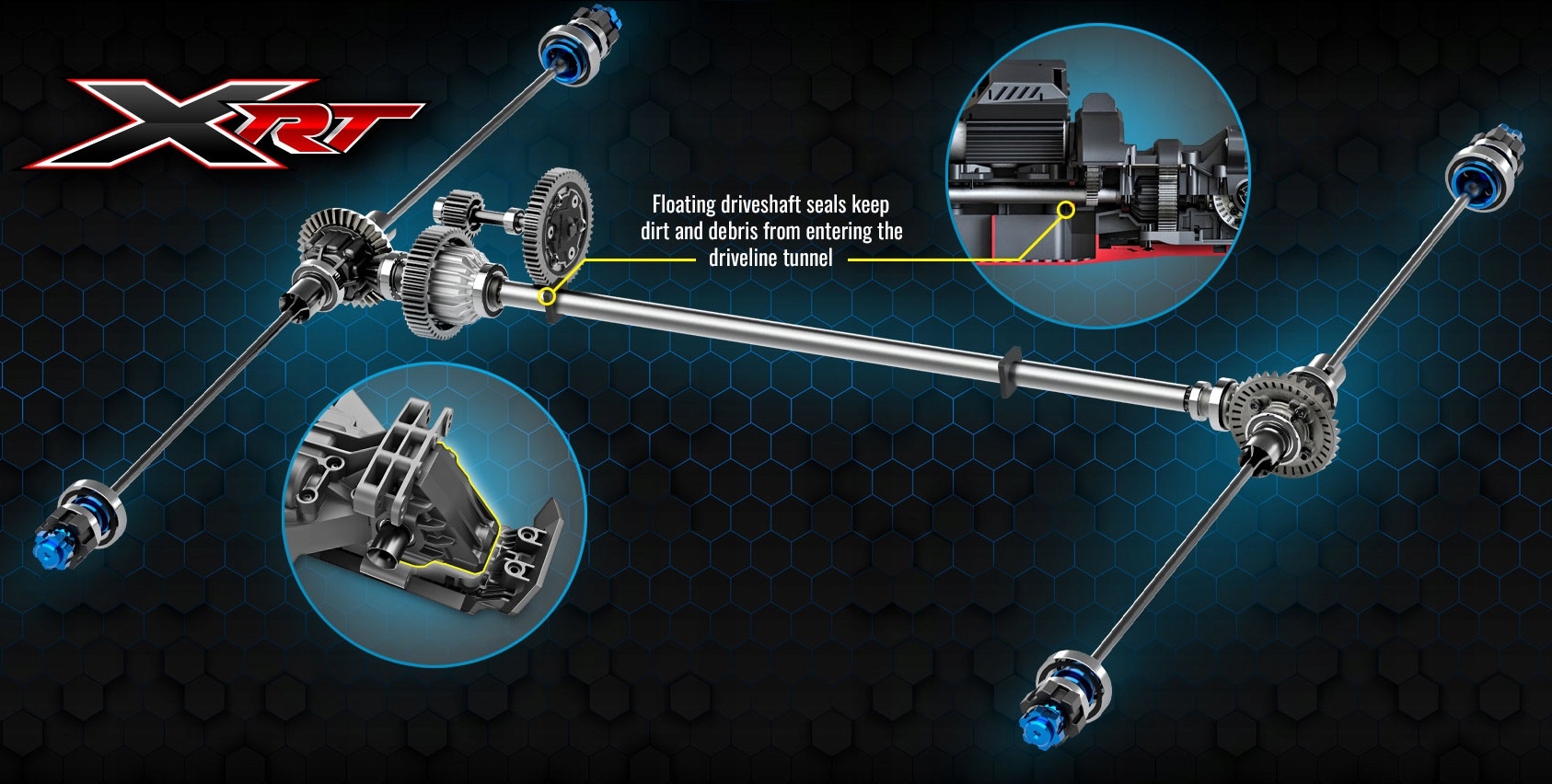 X-Maxx впервые продемонстрировал долговечность 8S благодаря металлической трансмиссии. В XRT используется та же трансмиссия Traxxas-Tough™ с герметичными дифференциалами и чрезвычайно прочными крышками дифференциалов для увеличения поддержки подшипников и устранения люфта.