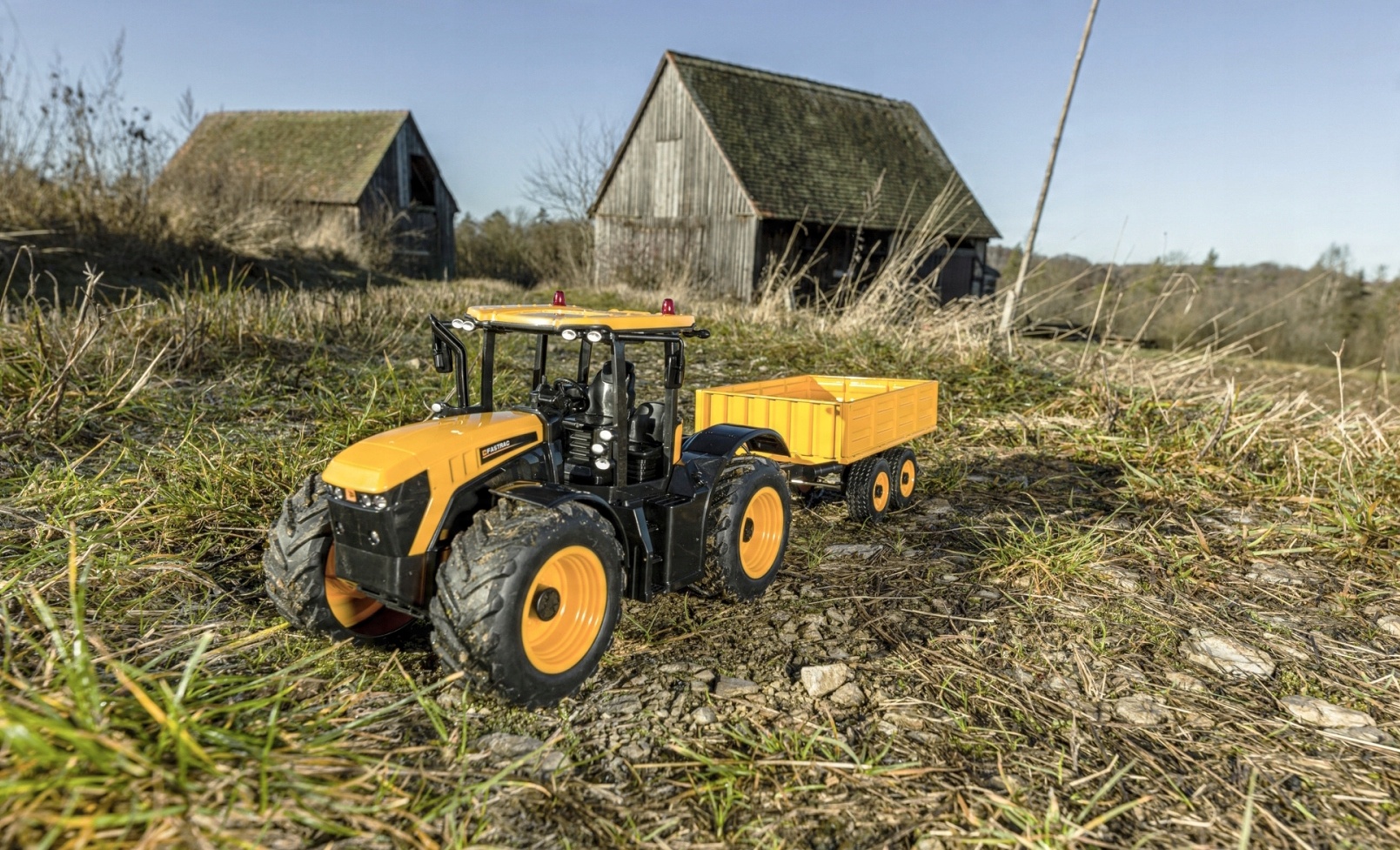ТРАКТОР С ДИСТАНЦИОННЫМ УПРАВЛЕНИЕМ С ПРИЦЕПОМ, МОДЕЛЬ JCB FASTRAC 4200 В МАСШТАБЕ 1/16