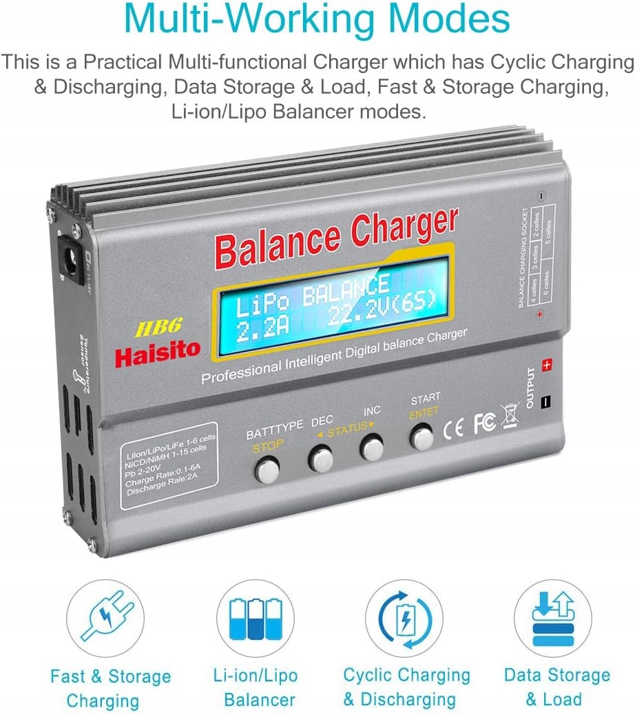 Зарядное устройство Haisito imax b6 встроено в независимый баланс литийной батареи для мониторинга и сопоставления каждой батарейной ячейки и оснащен быстрой зарядкой и зарядкой, сохранением и зарядкой данных, а также циклической зарядкой и разгрузкой