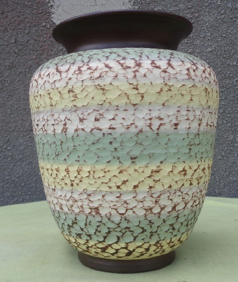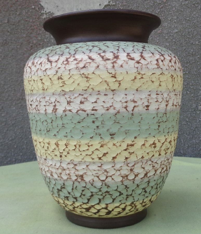 Красивая, элегантная керамическая ваза ручной работы 1910-1930 годов. Экспонат имеет интересную, шероховатую поверхность. Он был расписан вручную разноцветными красками. Есть оттенки желтого, зеленого и белого. Основание и дно вазы натурального коричневого цвета. Ваза имеет небольшой дефект, который виден на фотографиях. Экспонат подписан, подпись видна на фотографиях. Всем рекомендую.