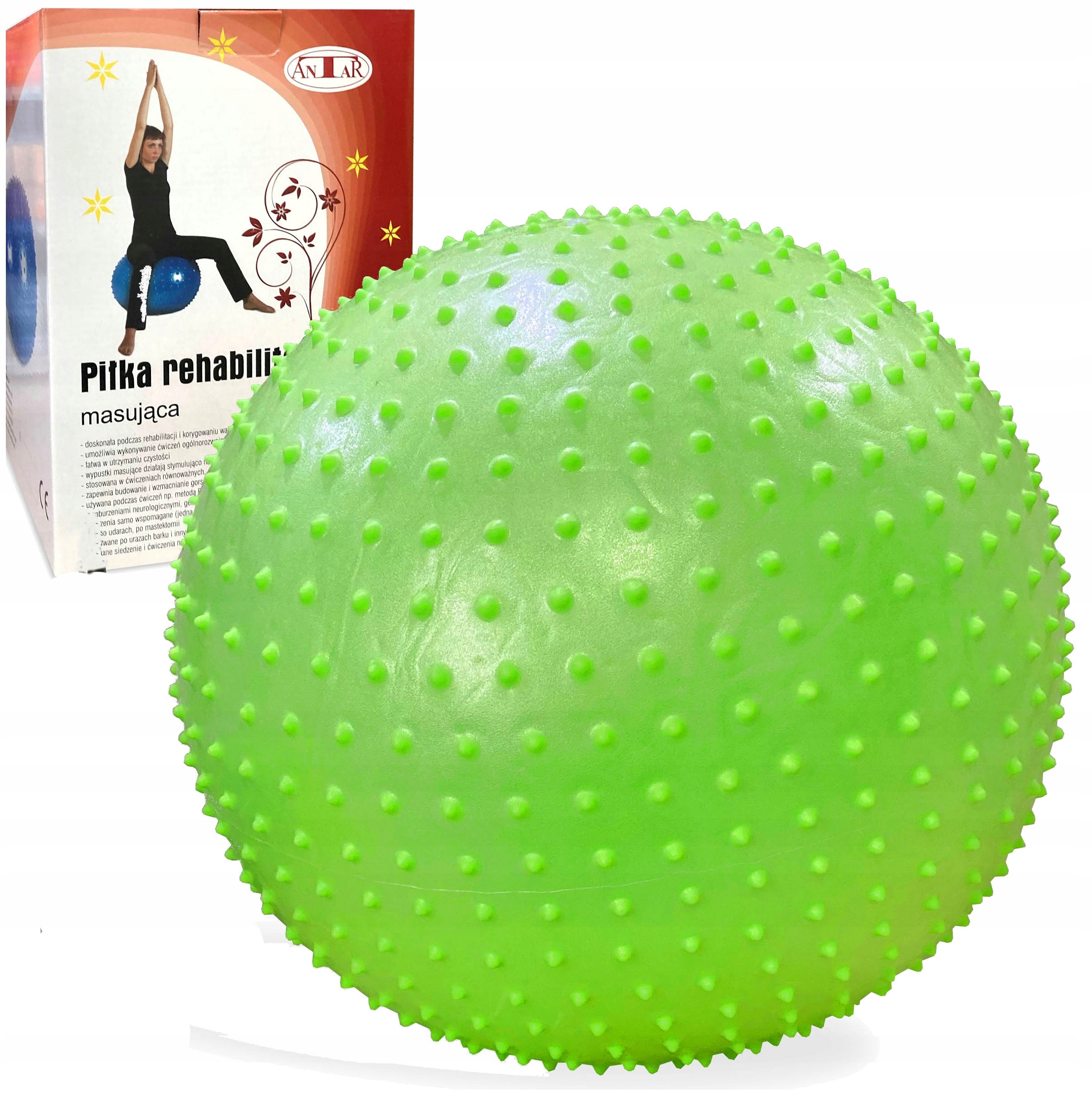 Гимнастический и реабилитационный мяч Антар можно использовать для ряда укрепляющих, корректирующих и упражнения на растяжку. Он изготовлен из толстой резины, которую трудно проколоть, но которую легко содержать в чистоте. Изготовленный в системе ABS, это означает, что в случае прокола воздух будет медленно выходить. Он оснащен мягкими выступами, обеспечивающими непрерывный массаж во время тренировки и стимулирующими кожные рецепторы. Диаметр полностью надутого мяча 65 см – идеальный размер для людей ростом 160-180 см.
