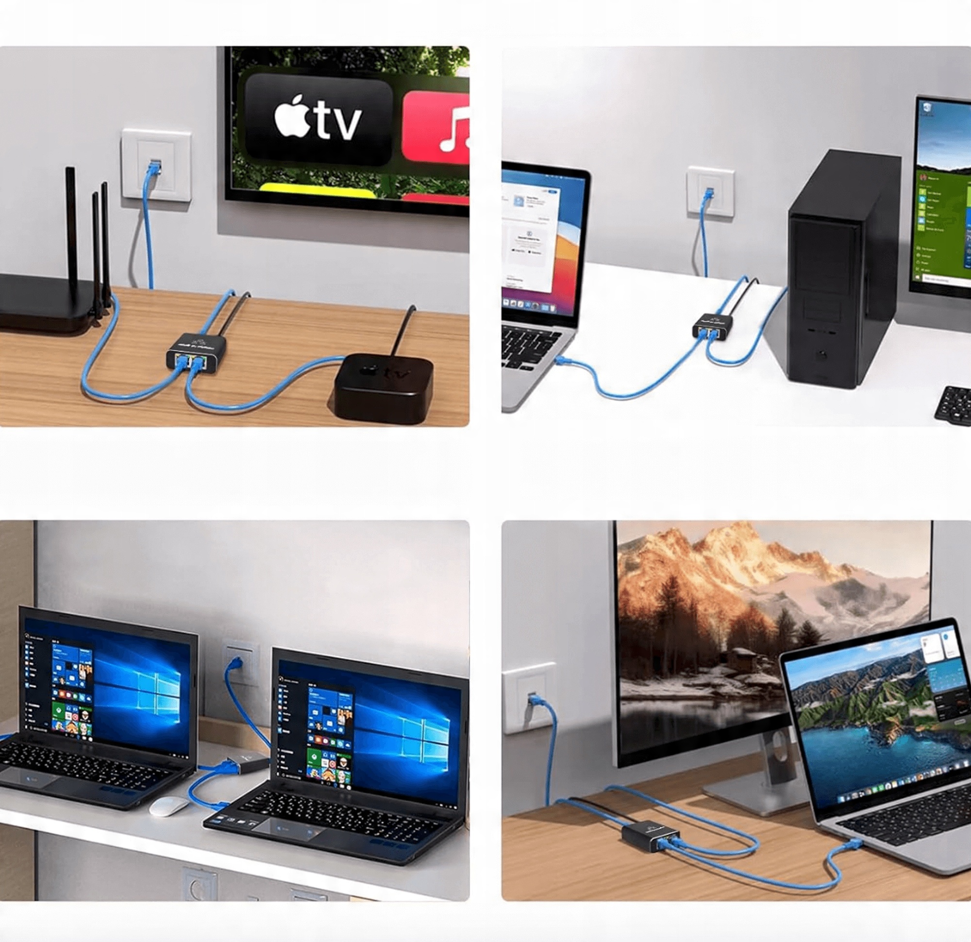- Позволяет подключить два устройства, например компьютер, телевизор или консоль, к одному источнику, например маршрутизатору или модему.