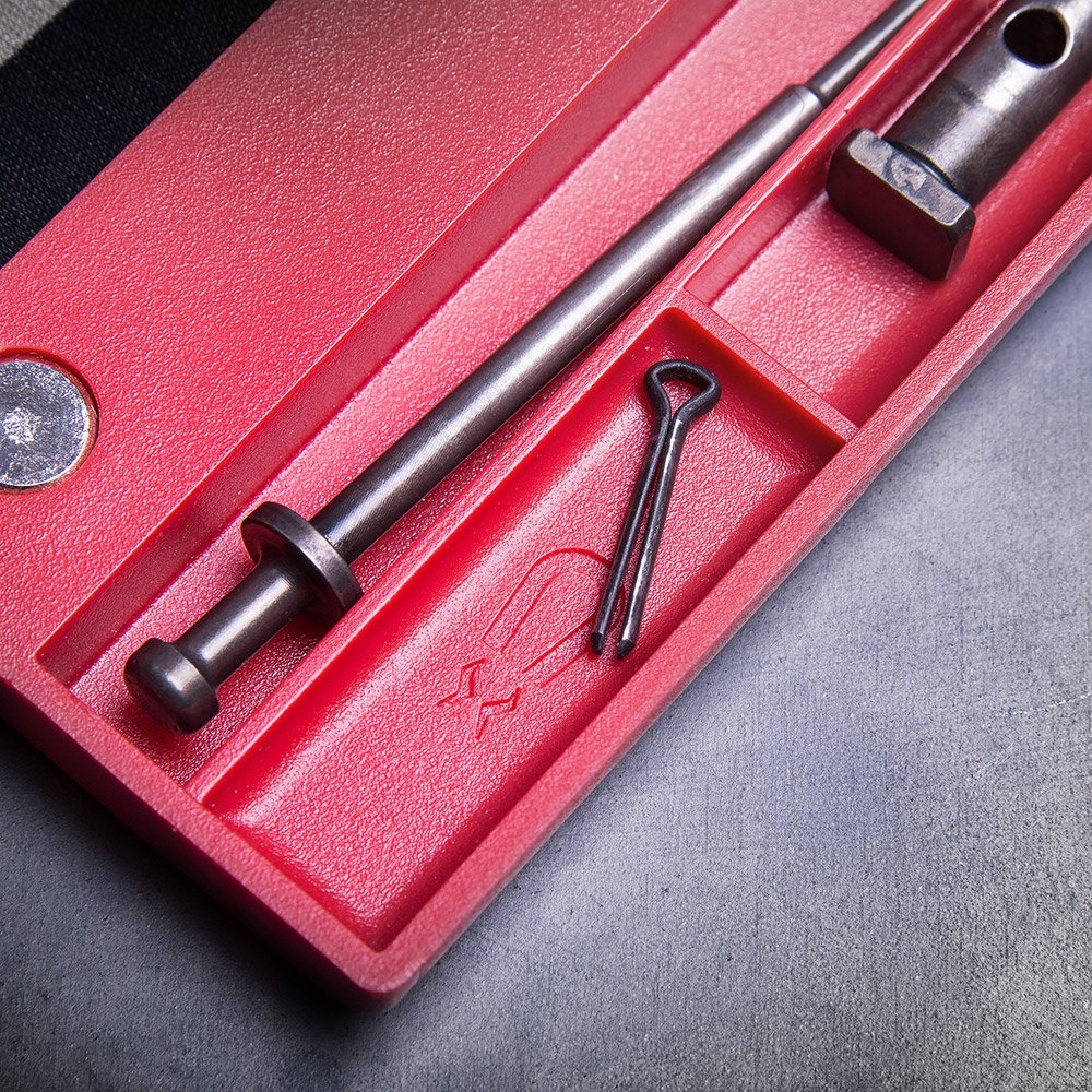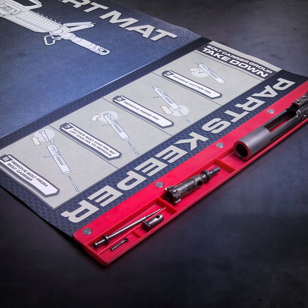 Противоскользящий коврик с маслостойкой поверхностью защищает как компоненты оружия, так и поверхность столешницы от повреждений. Органайзер для деталей с магнитным лотком, прикрепленным к его правому краю, предотвращает потерю разобранных элементов.