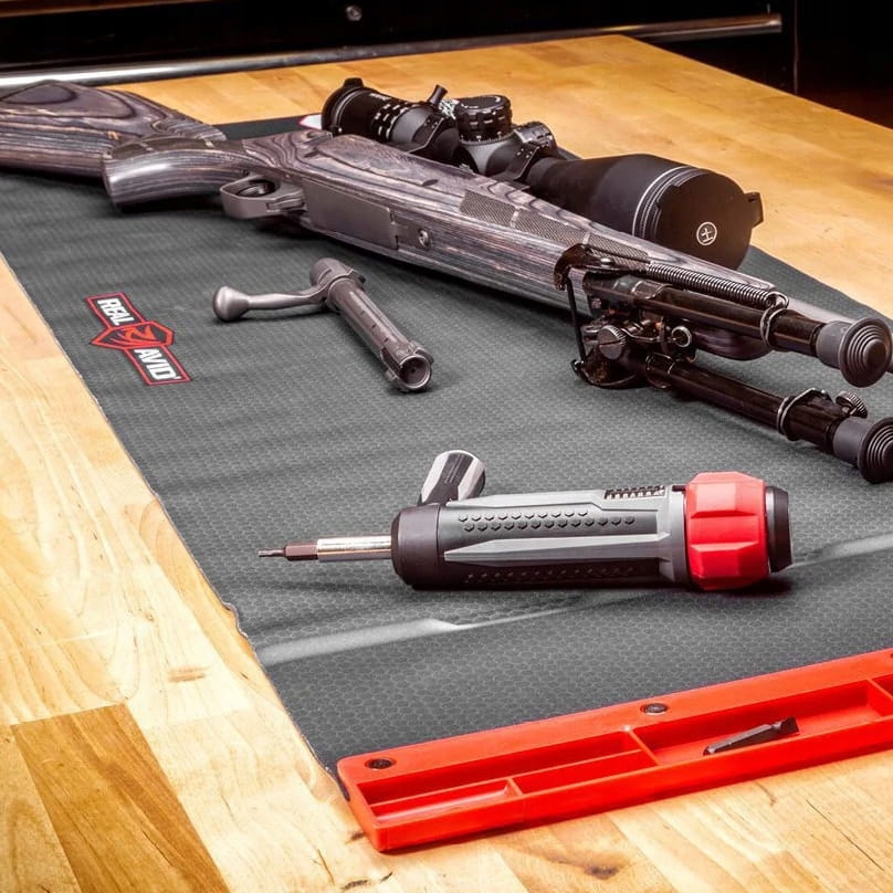 Если вы чистите оружие в месте, которое точно не хотите повредить, профессиональный коврик Real Avid Universal Smart Mat определенно станет для вас хорошим выбором. Сочетание просторного рабочего пространства с чрезвычайно эффективной изоляцией, предотвращающей попадание препаратов на поверхность столешницы, гарантирует адекватную защиту письменного стола или стола. Размеры позволяют с успехом разместить на нем как карабин, так и дробовик.