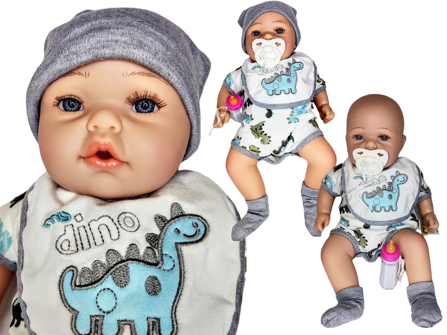 Кукла Адар — маленький милый мальчик, одетый в боди с динозавровой тематикой, нагрудник с мотивом динозавра, носки и шапку.